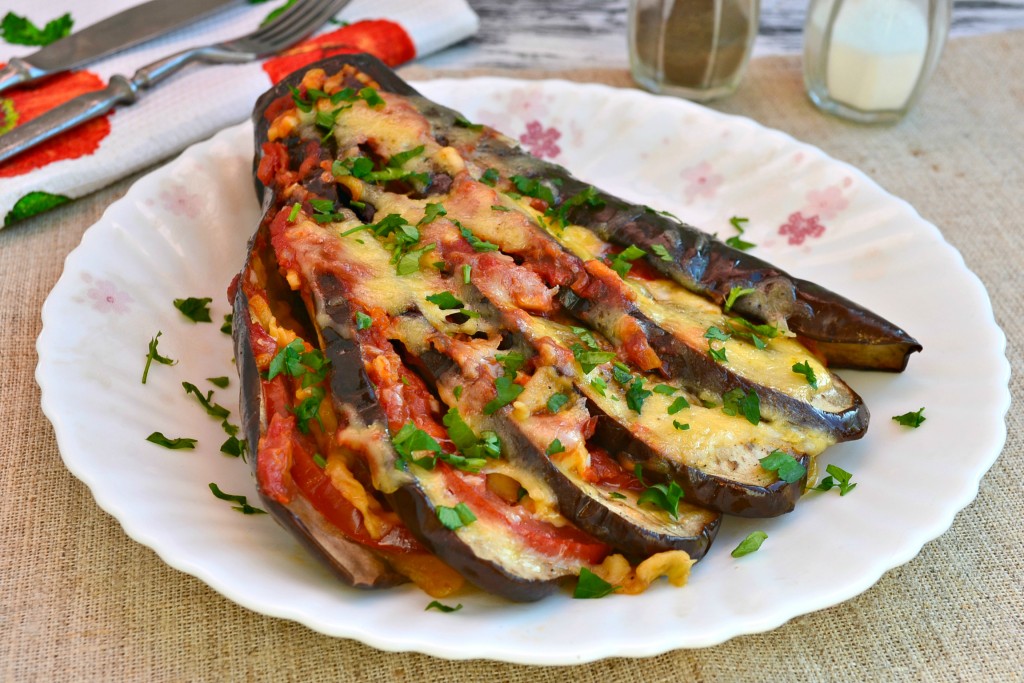 Очень вкусные, сытные и необычные веера из баклажанов, приготовленные с сыром и помидорами в духовке, подать к столу в горячем виде, посыпав измельченной зеленью петрушки.