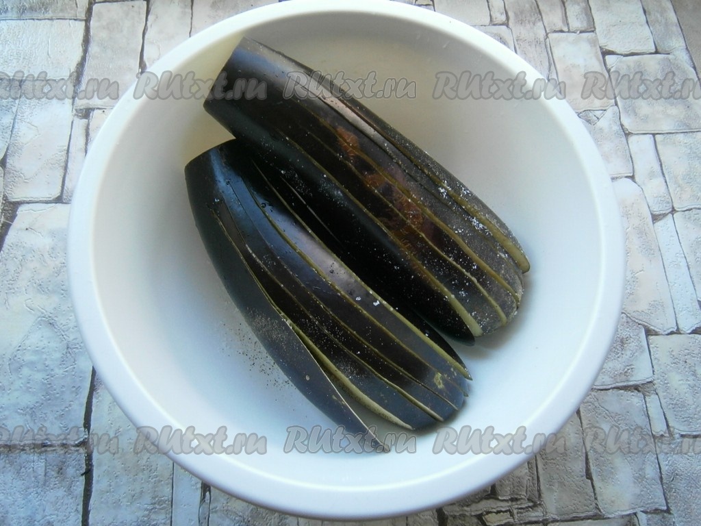 Затем баклажаны посолить и поперчить, чтобы соль и чёрный молотый перец попали и в разрезы, оставить на 30 минут.
