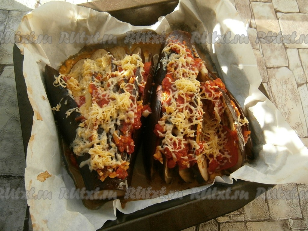 Затем фольгу убрать и посыпать баклажаны натертым на терке оставшимся сыром. Запекать баклажаны еще минут 10 при той же температуре.