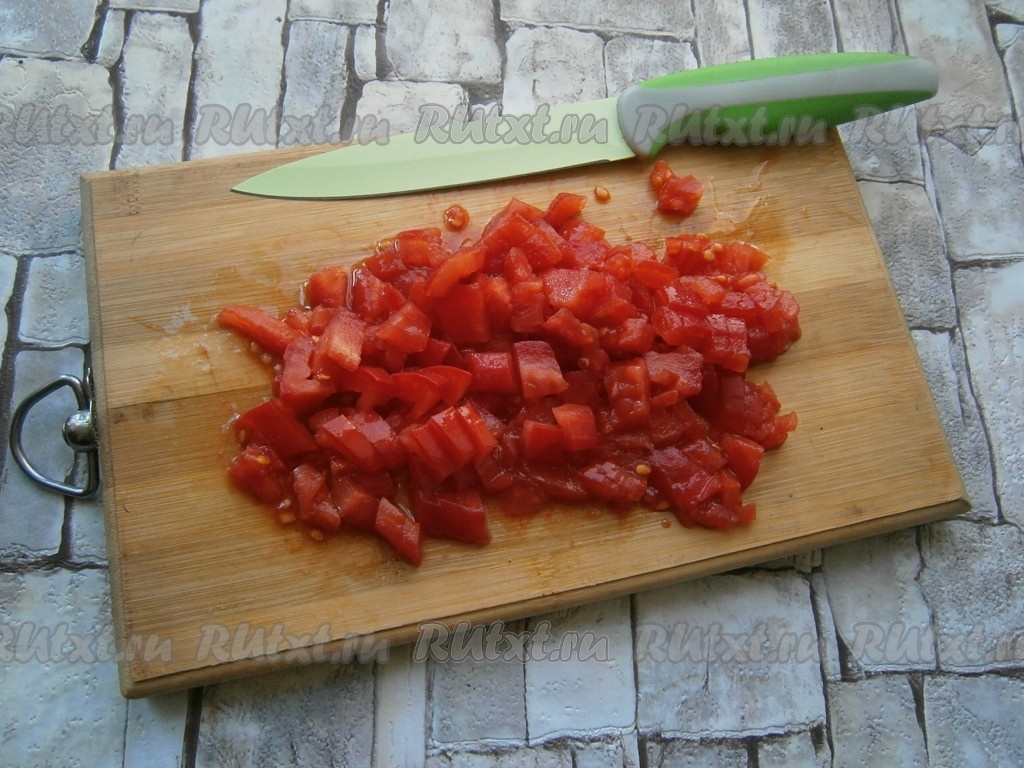 Нарезать помидоры небольшими кубиками.