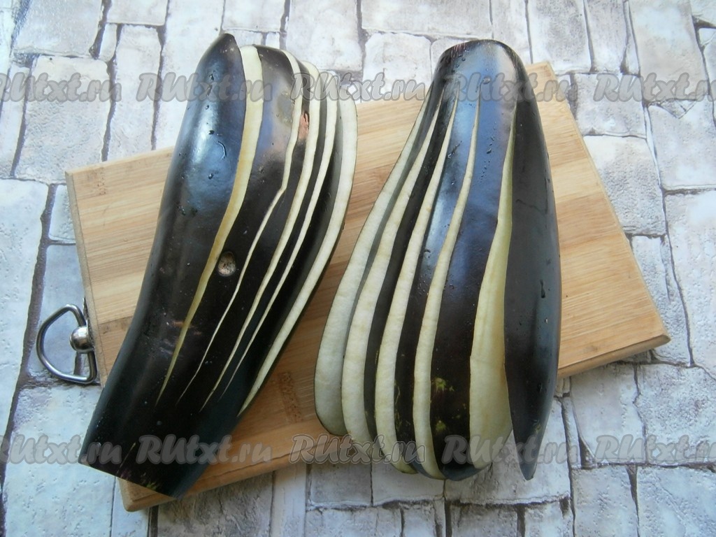 В каждом баклажане сделать по 5 разрезов вдоль, но не до конца, начиная разрезы с противоположной к хвостовой части стороны баклажанов (как на фото).