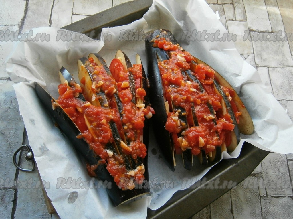Форму для запекания застелить бумагой и разместить веера из баклажанов. Сверху веера полить приготовленным томатным соусом.