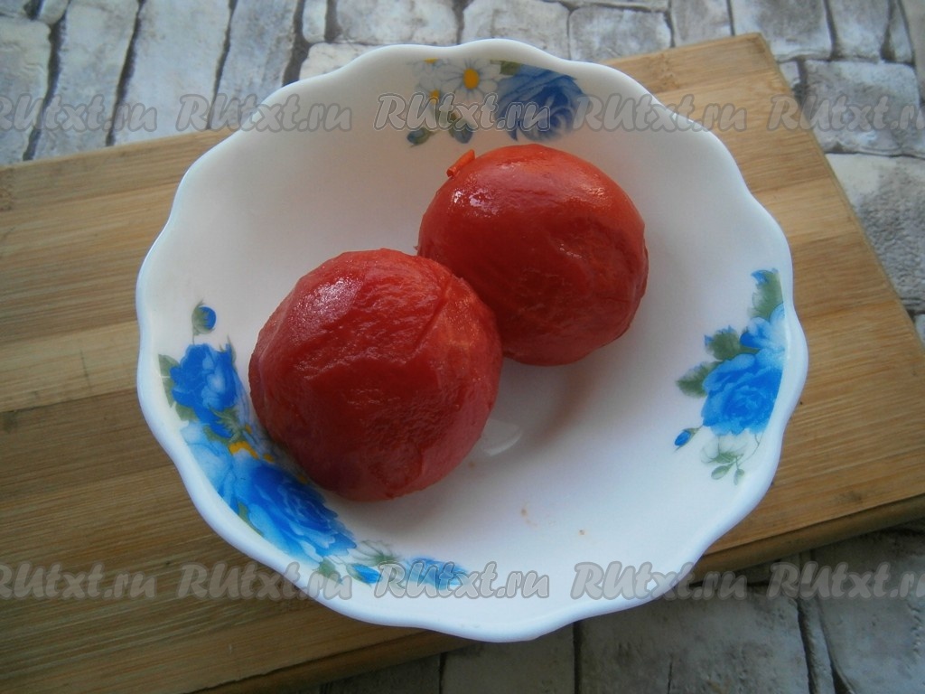 Два помидора залить кипятком на несколько минут и очистить от шкурки.