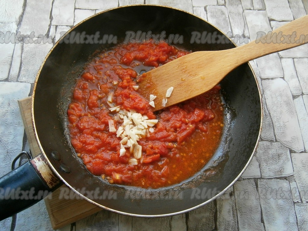 Разогреть в сковороде растительное масло, выложить помидоры, обжарить их на среднем огне в течение нескольких минут, помешивая. Затем добавить соль и сахар, влить немного лимонного сока, протушить на небольшом огне, пока помидоры не размякнут (в результате должен получиться соус). Добавить измельченный чеснок, соус прогреть еще 1 минуту на огне и выключить газ.
