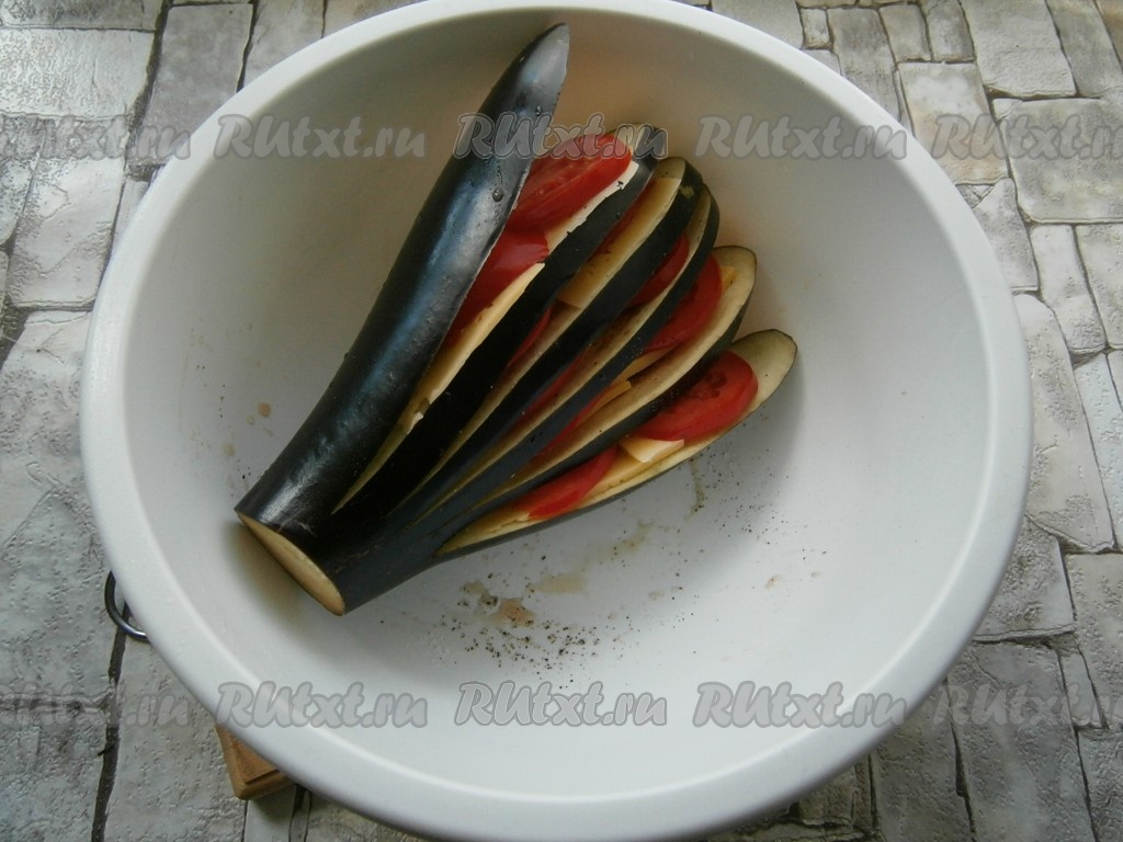 Оставшиеся свежие помидоры нарезать на кружочки. В каждый разрез баклажана вложить по 2-3 кружочка помидоров и по 2 тонких пластины сыра (немного сыра оставить для запекания баклажанов). Аналогично приготовить и второй веер из баклажанов с помидорами и сыром.