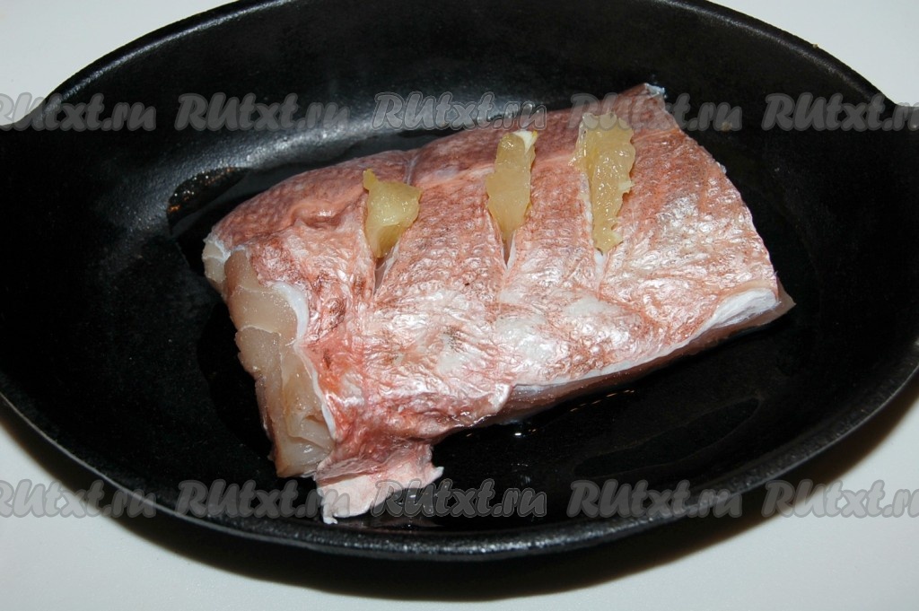 Сделаем надрезы в кусочках филе рыбы. В каждый надрез вставим по маленькой дольке лимона. Уложим кусочки рыбы в форму, слегка смазанную оливковым маслом. Отправим форму с рыбой в духовку, нагретую до 200 градусов на 20 минут.