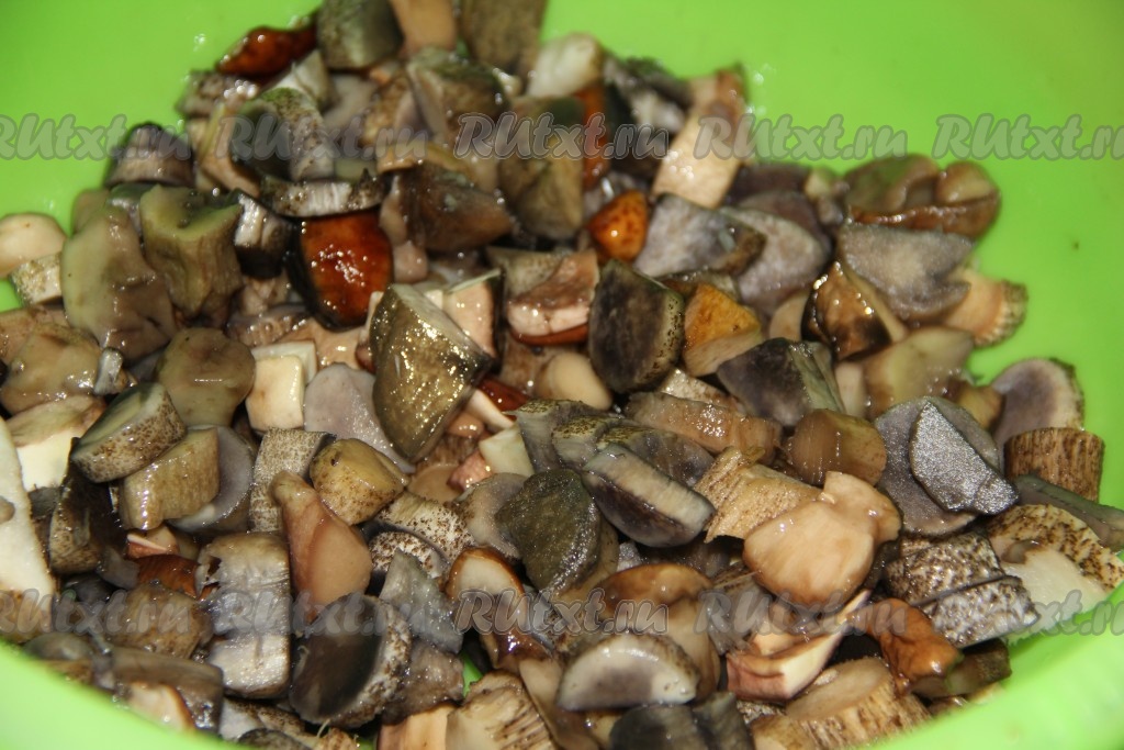 Морковку и лук очистить, из болгарских перцев удалить семенную коробку. Свежесобранные грибы почистить, если нужно, промыть водой, нарезать на кусочки среднего размера, выложить в кастрюлю и полностью залить водой.