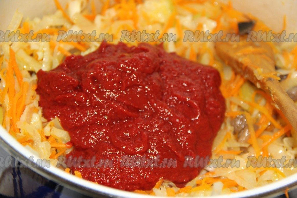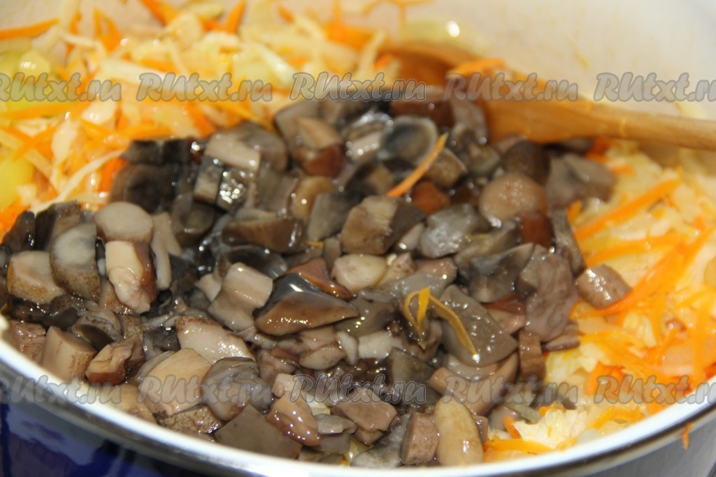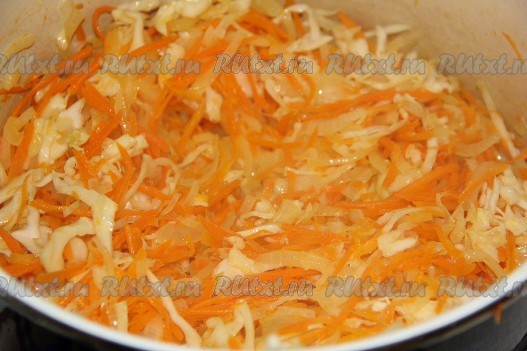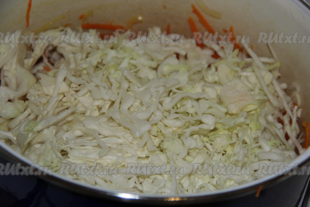 Когда овощи обжарятся, выложить к ним тонко нашинкованную капусту.
