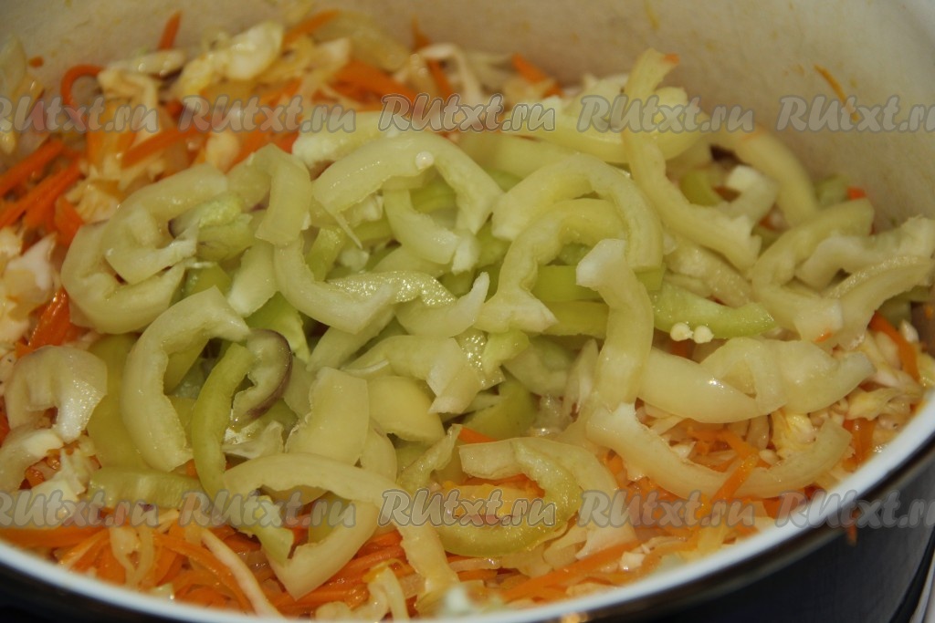 Затем к капусте, луку и морковке добавить болгарский перец, нарезанный длинными полосками.