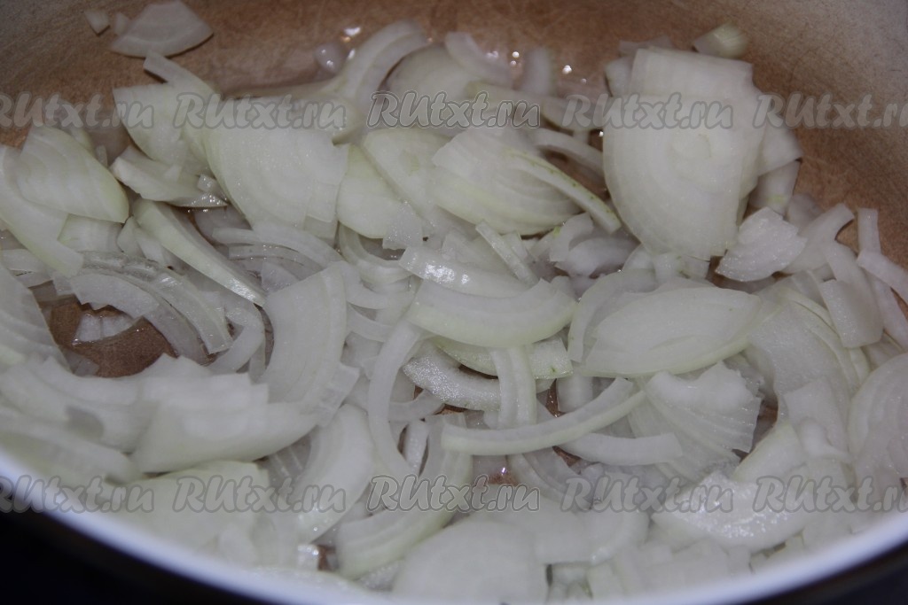 В толстостенную кастрюлю влить растительное масло, выложить лук, нарезанный на тонкие полукольца.