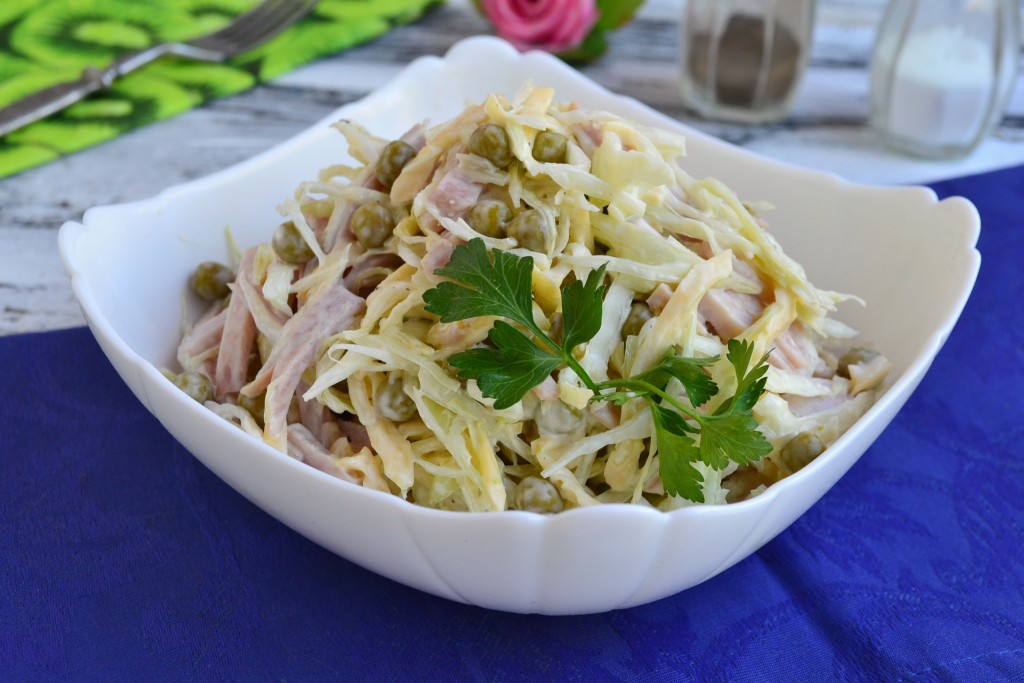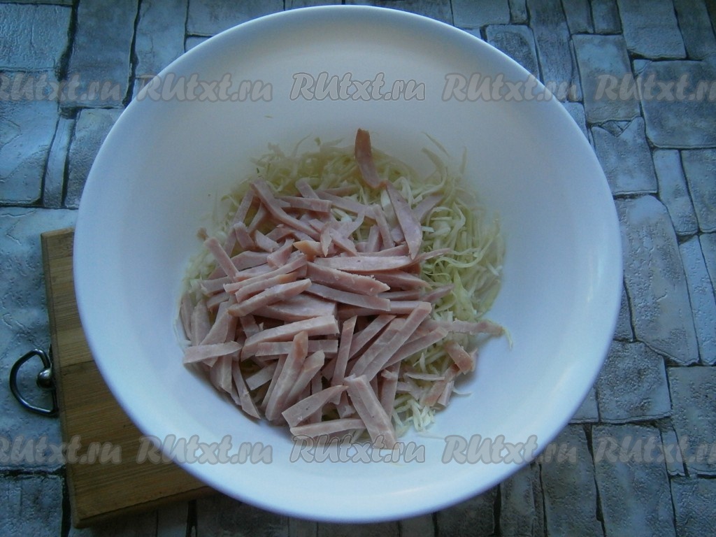 Ветчину нарезать тонкой соломкой или брусочками и добавить к капусте.