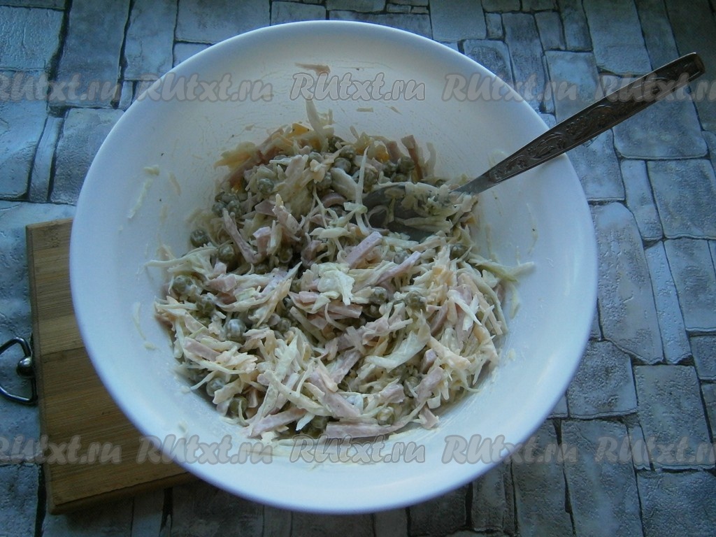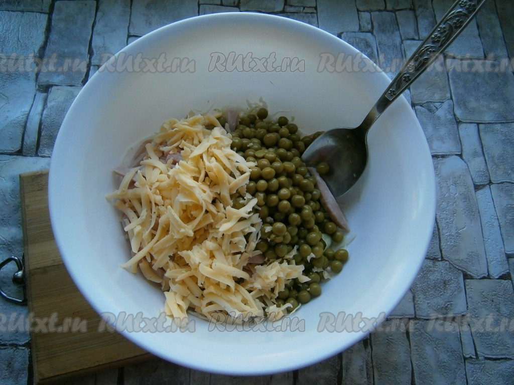 Сюда же добавить натертый на крупной терке сыр и консервированный горошек, предварительно слив с него жидкость.
