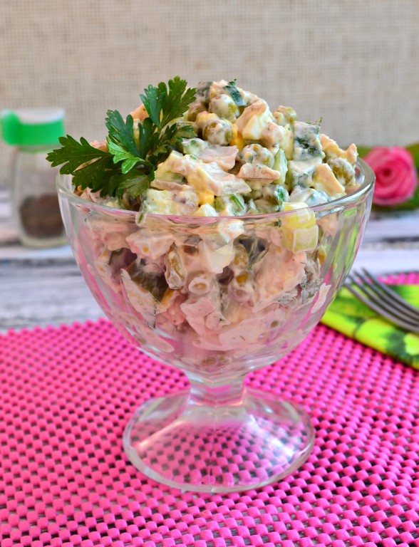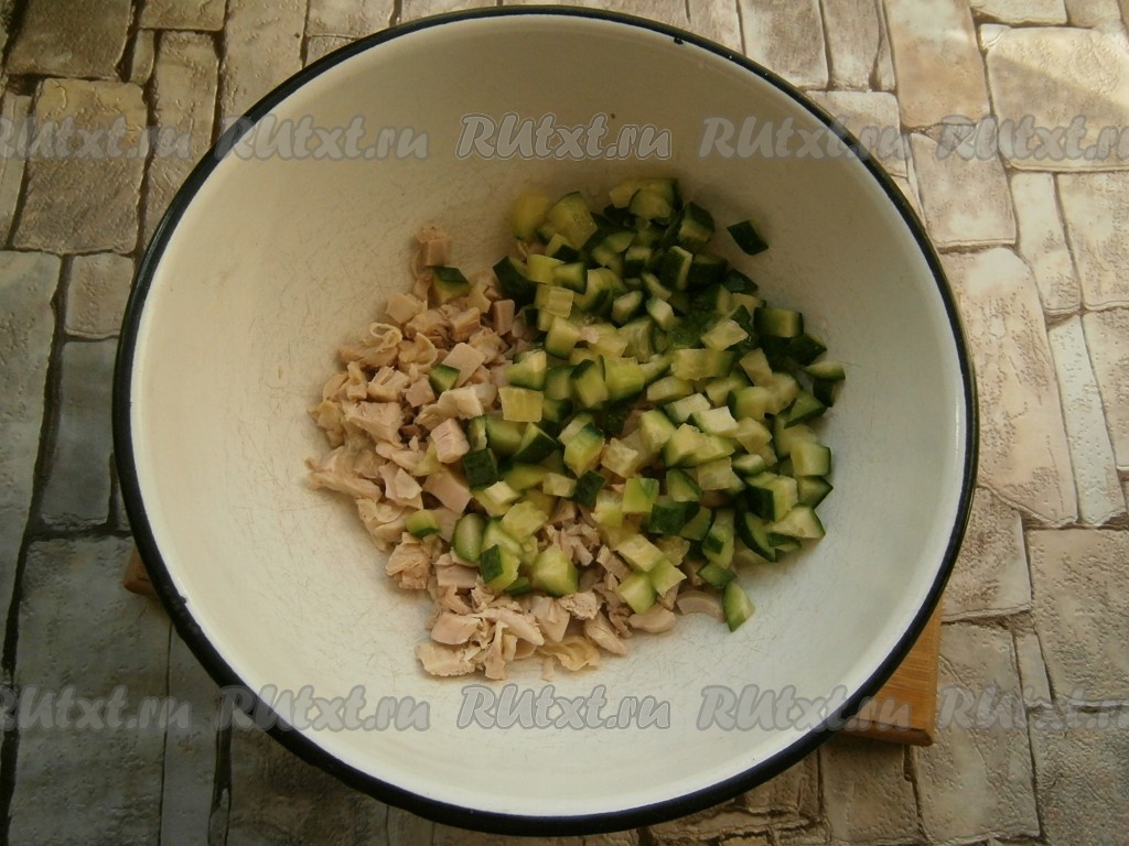 Куриное мясо, предварительно отваренное в подсоленной воде (в течение 40-45 минут), остудить и нарезать небольшими кусочками. К нарезанному мясу добавить свежие огурчики, нарезанные маленькими кубиками.