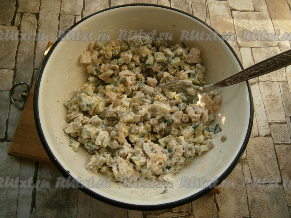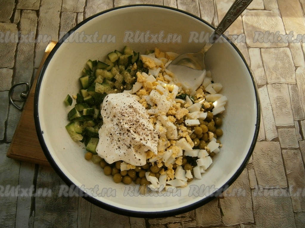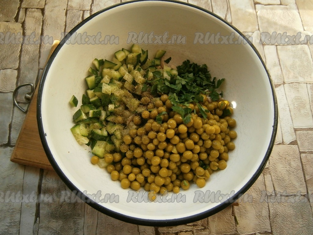 Добавить консервированный горошек, мелко нарезанный свежий укроп (или сушеный укроп) и измельченную петрушку.