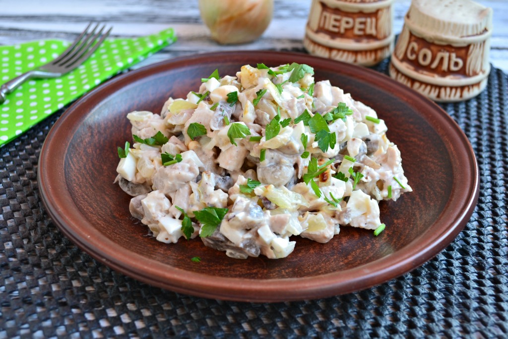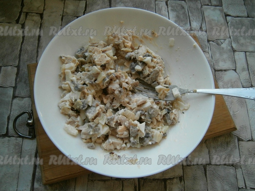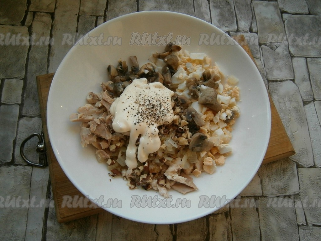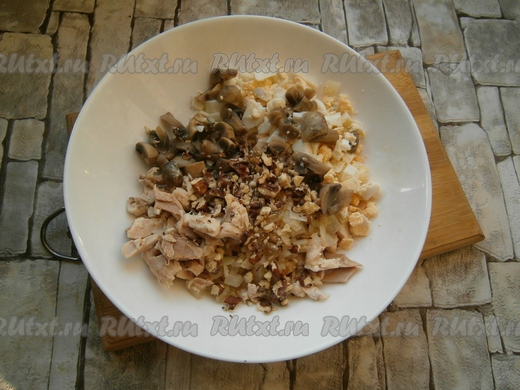 Куриное мясо, маринованные шампиньоны, яйца и жареный лук соединить в тарелке, добавить рубленные грецкие орехи.