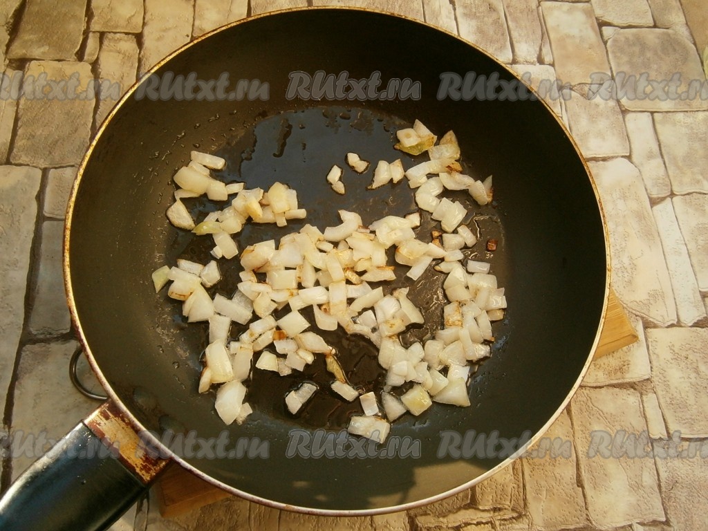 Обжарить на растительном масле очищенный и нарезанный небольшими кусочками репчатый лук до золотистости, затем остудить.