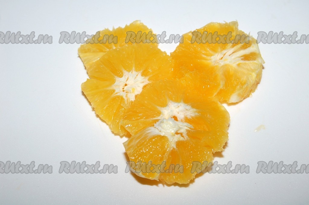 Апельсин очистить от кожуры и семечек. Нарезать на кружочки.
