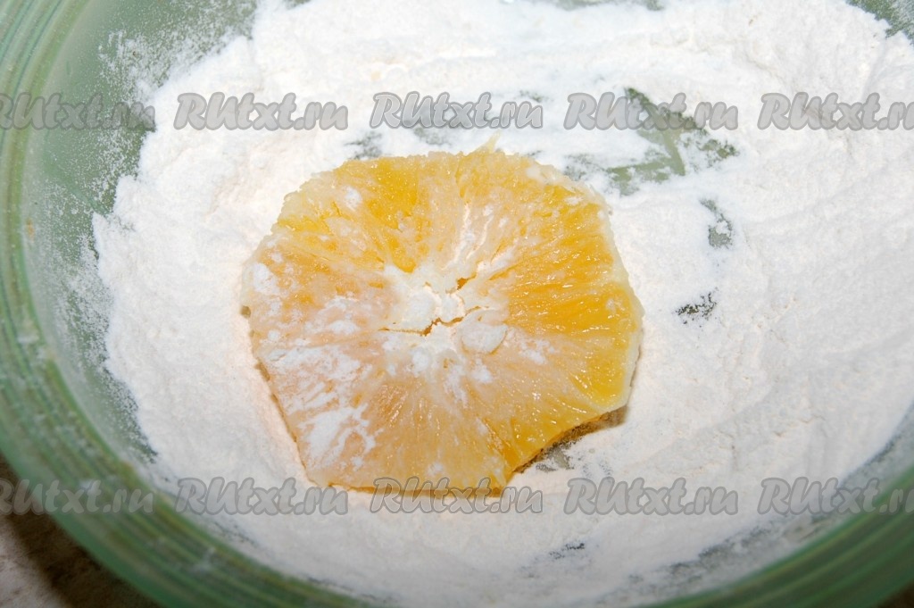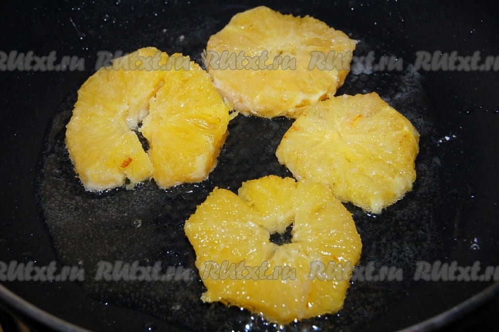 Обжаренные кусочки рыбы выложить на тарелку. А в этой же сковороде обжарить обваленные в муке кружочки апельсина, по 1 минуте с каждой стороны.
