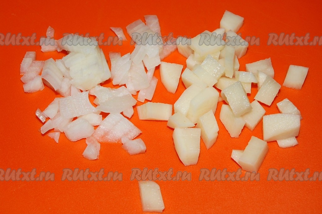 Нарезать картофель и лук репчатый мелкими кубиками.