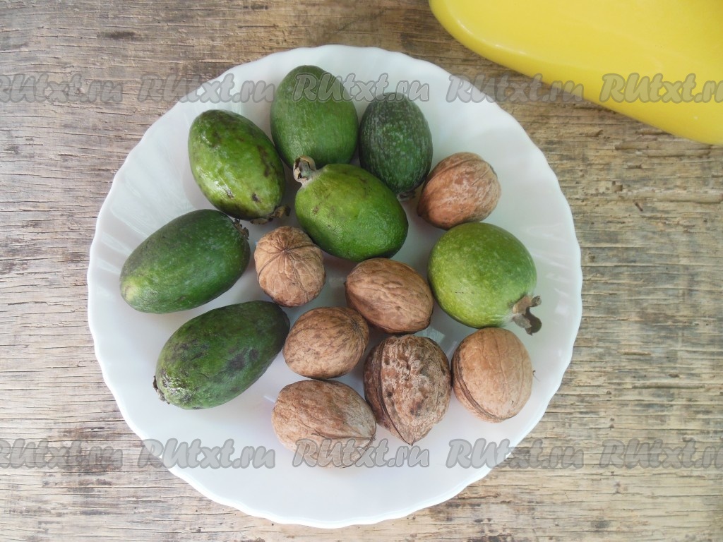 Грецкие орехи очистите от кожуры или используйте уже очищенные. Промойте плоды фейхоа, обсушите, затем разрежьте на две половинки, удалите нижнюю и верхнюю часть с чашелистиками. Так как в разрезанном виде фейхоа быстро темнеет, делать заготовку необходимо быстро.