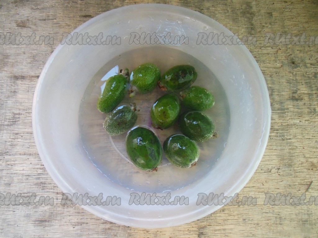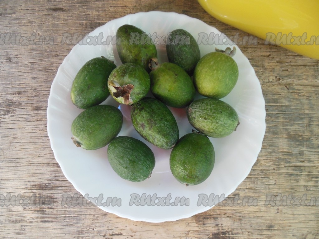 Фейхоа хорошо промойте, потому что готовить эту заготовку мы будем, не очищая ягоды от кожуры (в кожуре тоже содержится огромное количество витаминов). Если на кожуре есть пятна, их необходимо срезать. Отрежьте с нижней и верхней части каждого плода небольшую часть с чашелистиками.
