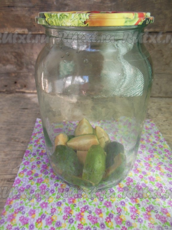 Банку тщательно промойте, простерилизуйте удобным для вас способом. Я стерилизую банку так: в кастрюлю наливаю, примерно, 300-500 мл, сверху на кастрюлю ставлю круг для стерилизации банки, как только вода в кастрюле закипит, ставлю в круг банку горлышком вниз (вода не должна касаться горлышка банки) и стерилизую около 3-5 минут на небольшом огне. Крышку для закатки банки обдайте кипятком.