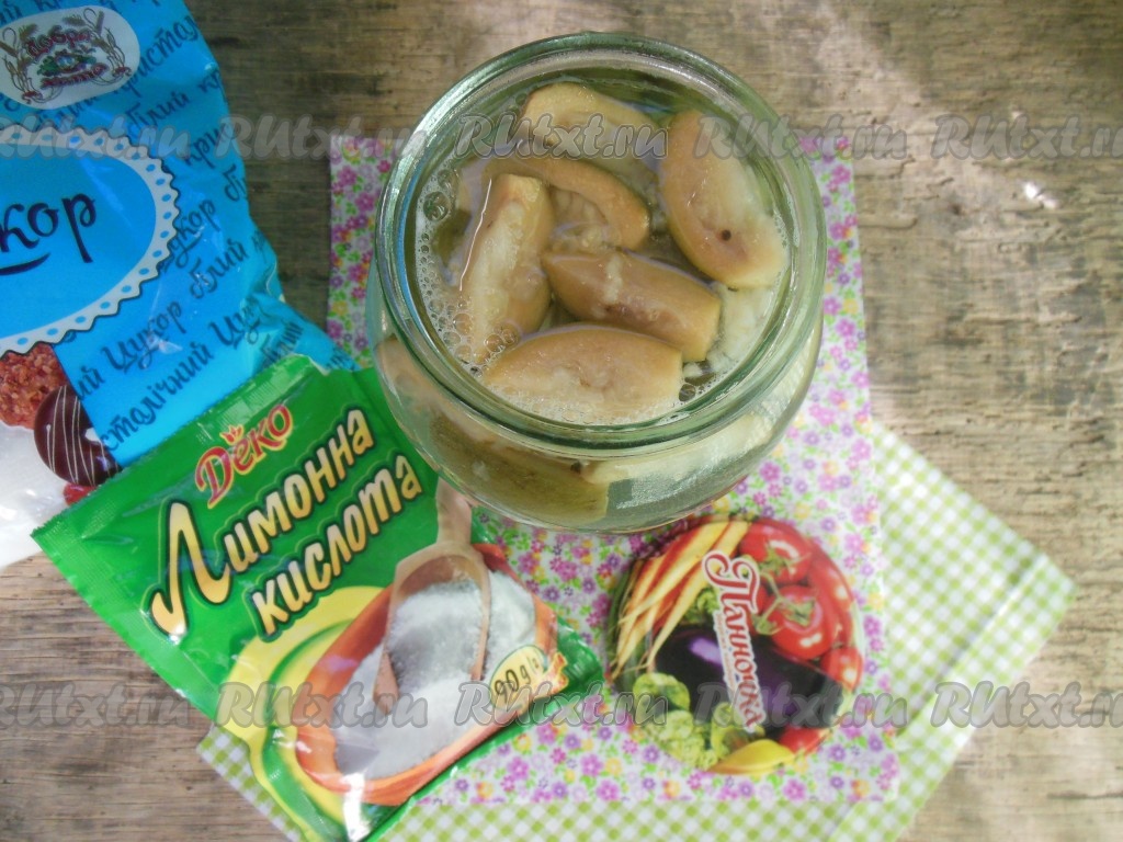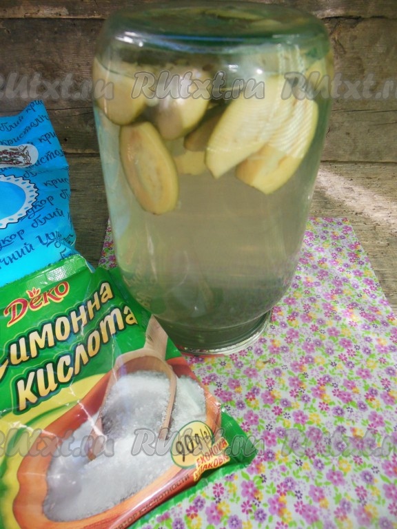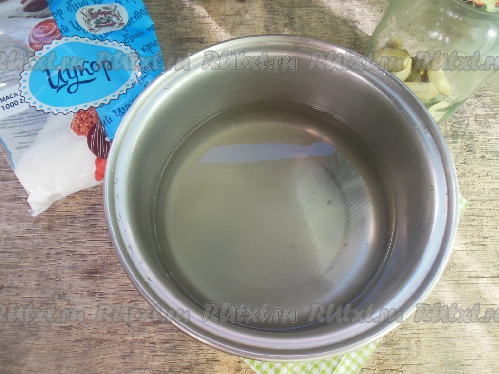 По истечении времени аккуратно слейте воду из банки в кастрюлю (очень удобно сливать воду из банки с помощью специальной крышки). В кастрюлю с водой добавьте сахар и небольшую щепоточку лимонной кислоты, доведите сироп до кипения, проварите около 3 минут (сахар должен полностью раствориться).