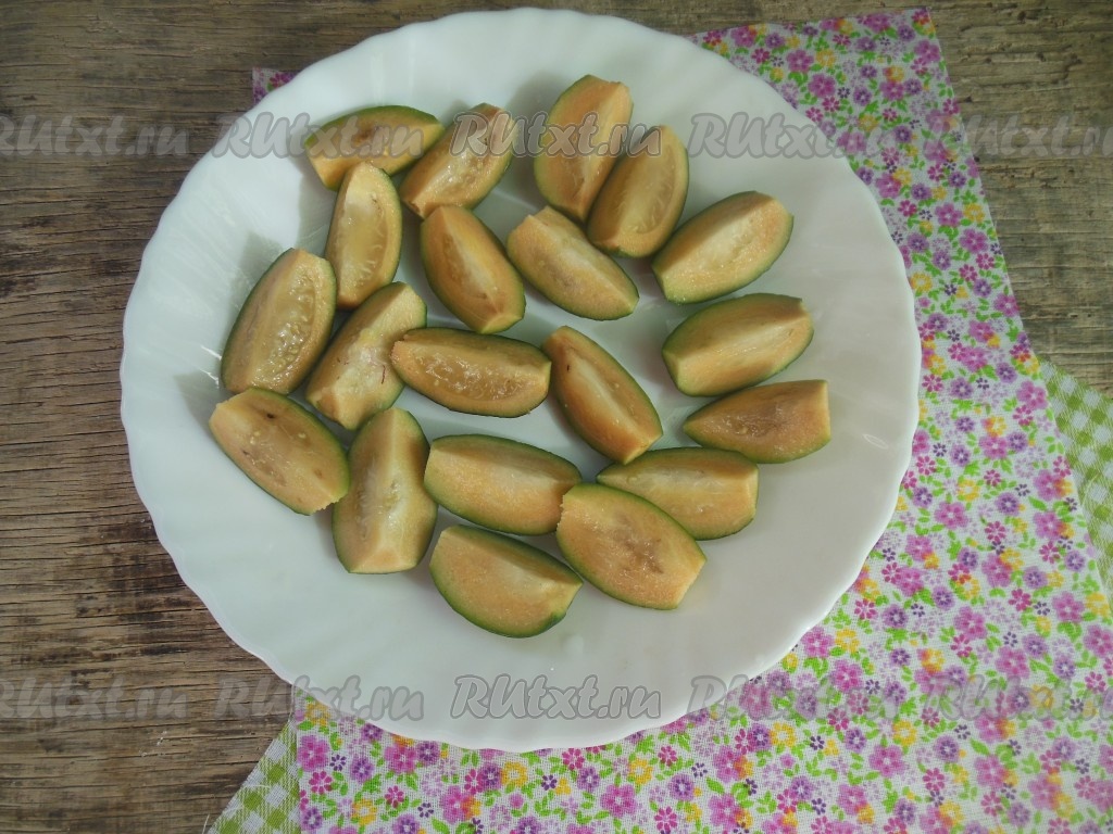 Фейхоа промойте под проточной водой. Удалите чашелистики. Если плоды крупные, разрежьте их на половинки. Я разрезала на небольшие долечки.
