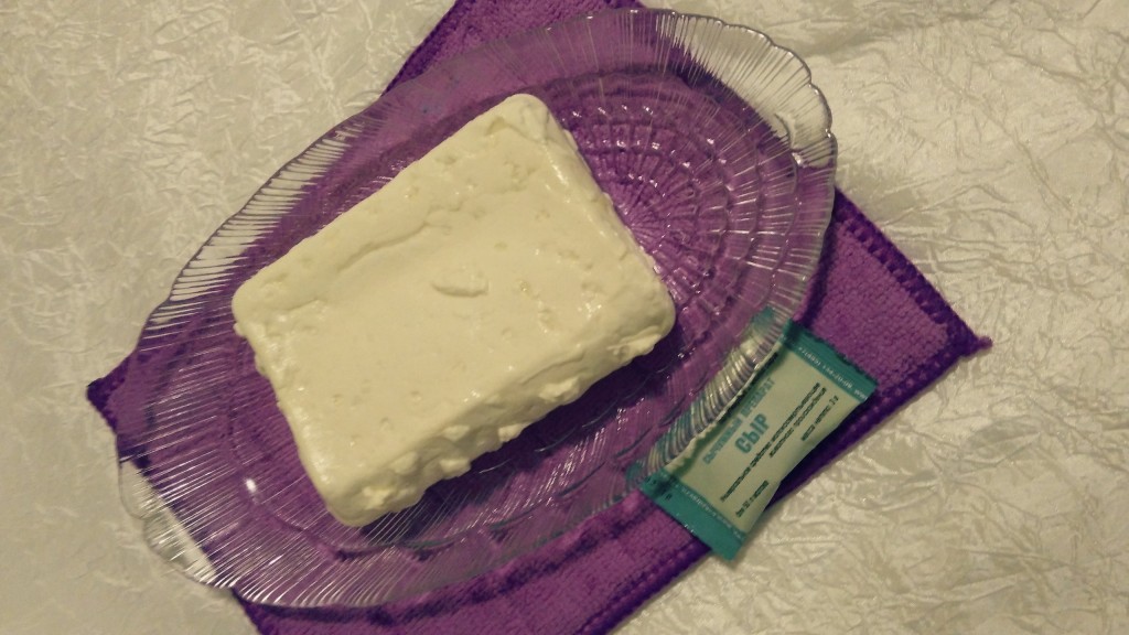 В течение следующих 3-х часов масса самопрессуется и уплотняется, сыр следует переворачивать каждый час для формирования более красивой головки. После этого сыр отправляем на просолку: в одном литре охлажденной кипяченой воды растворяем 200 грамм соли, погружаем в емкость с водой сыр и оставляем на 1,5-2 часа.