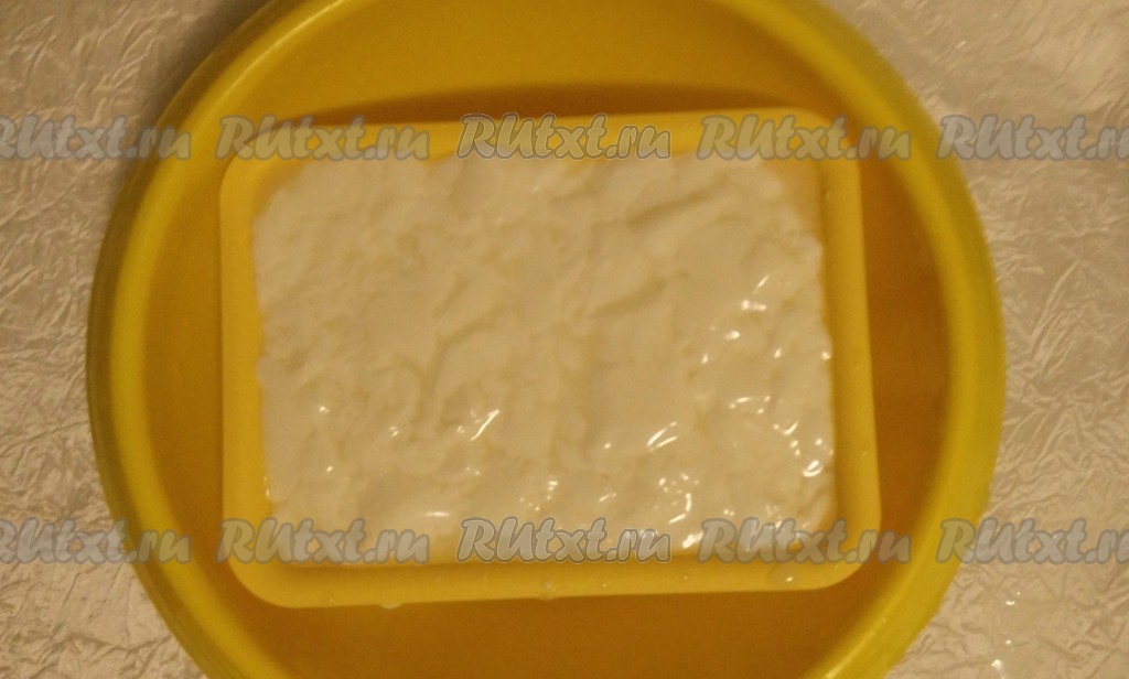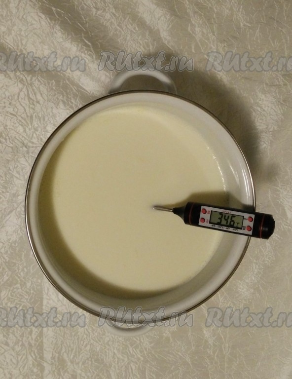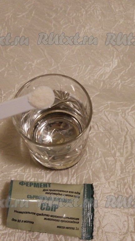 Затем развести в 50 мл кипяченой охлажденной воды 0,18 мг сычужного фермента, добавить в молоко и плавно перемешать.