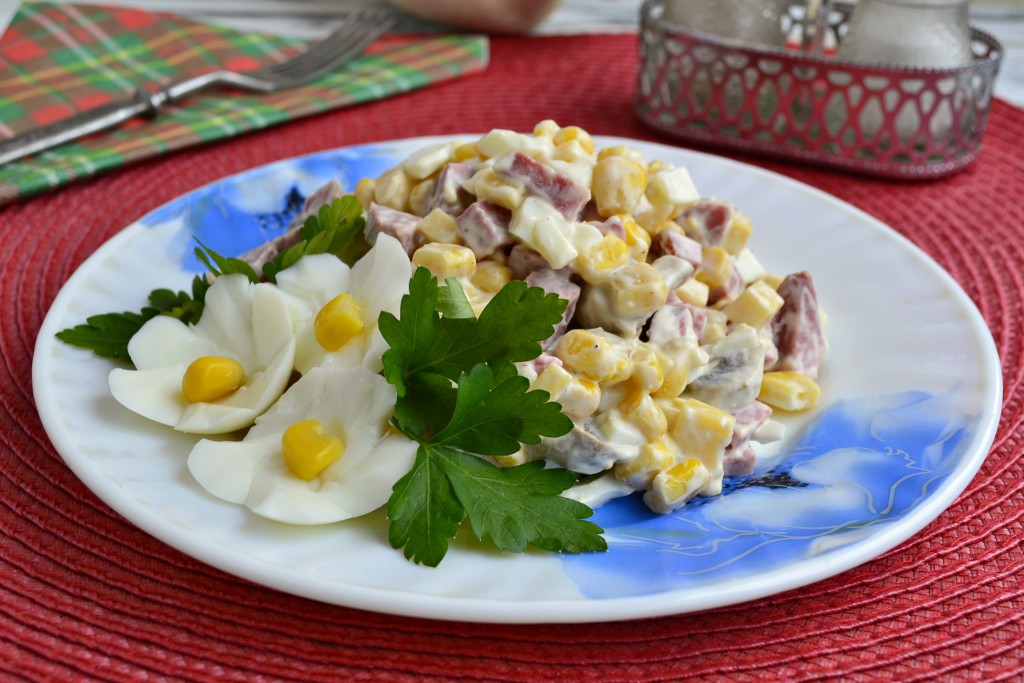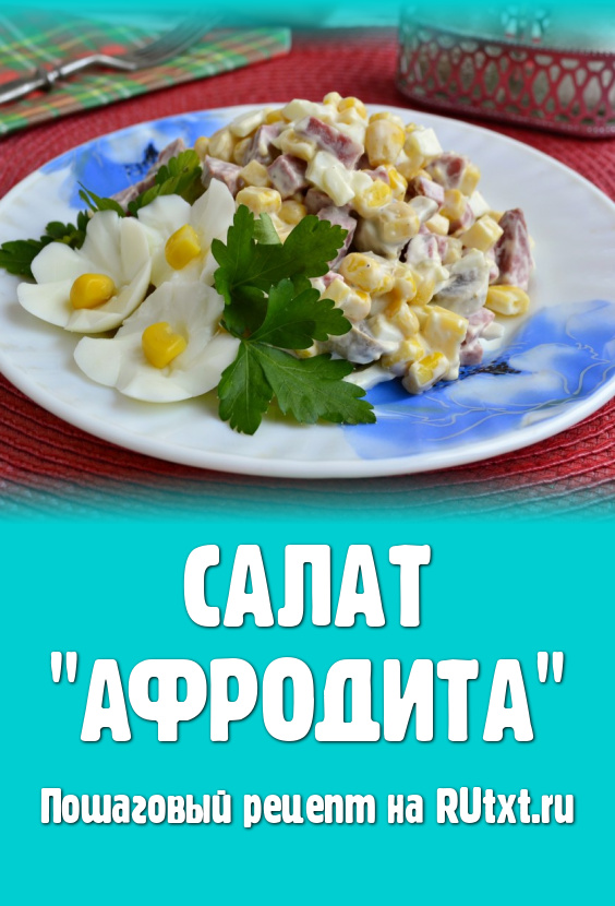 Предлагаю приготовить салат с очень красивым названием "Афродита". Этот салатик простой и очень вкусный. Для приготовления салата я использовала варено-копченую колбасу, её можно заменить на ветчину или копченое мясо. Этот замечательное блюдо можно подать и к праздничному столу, и в будний день, попробуйте!
