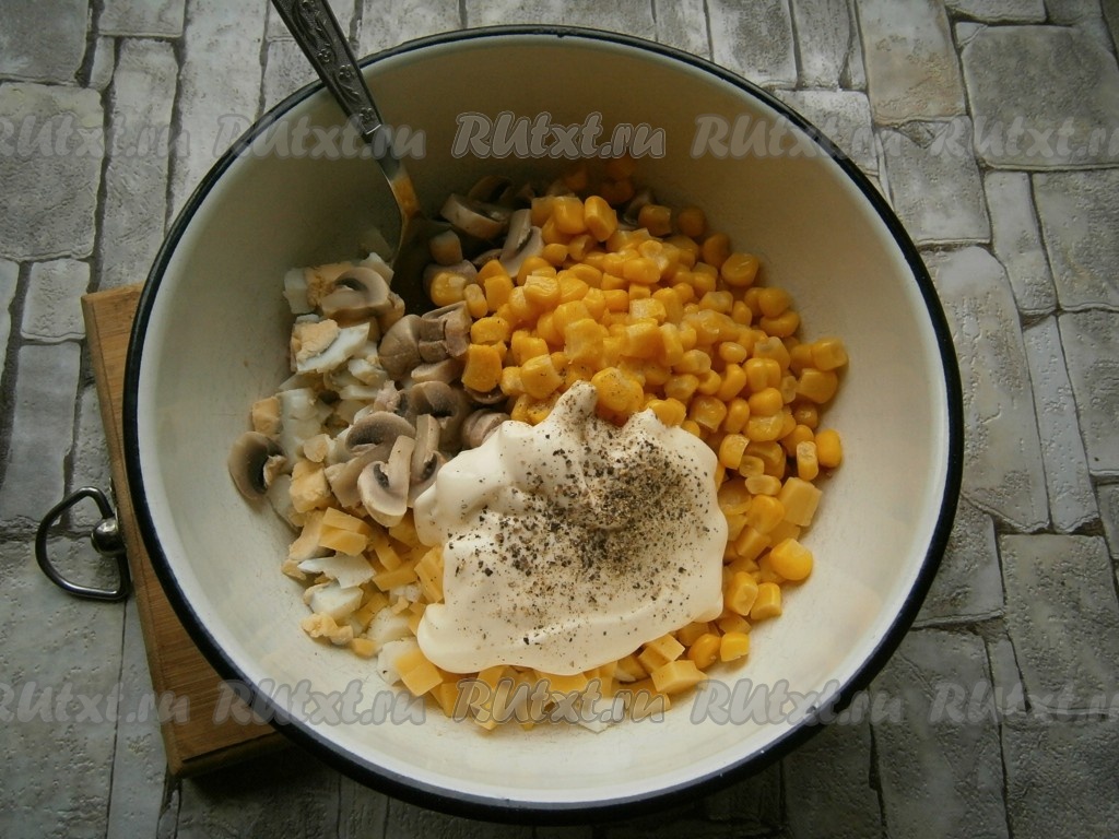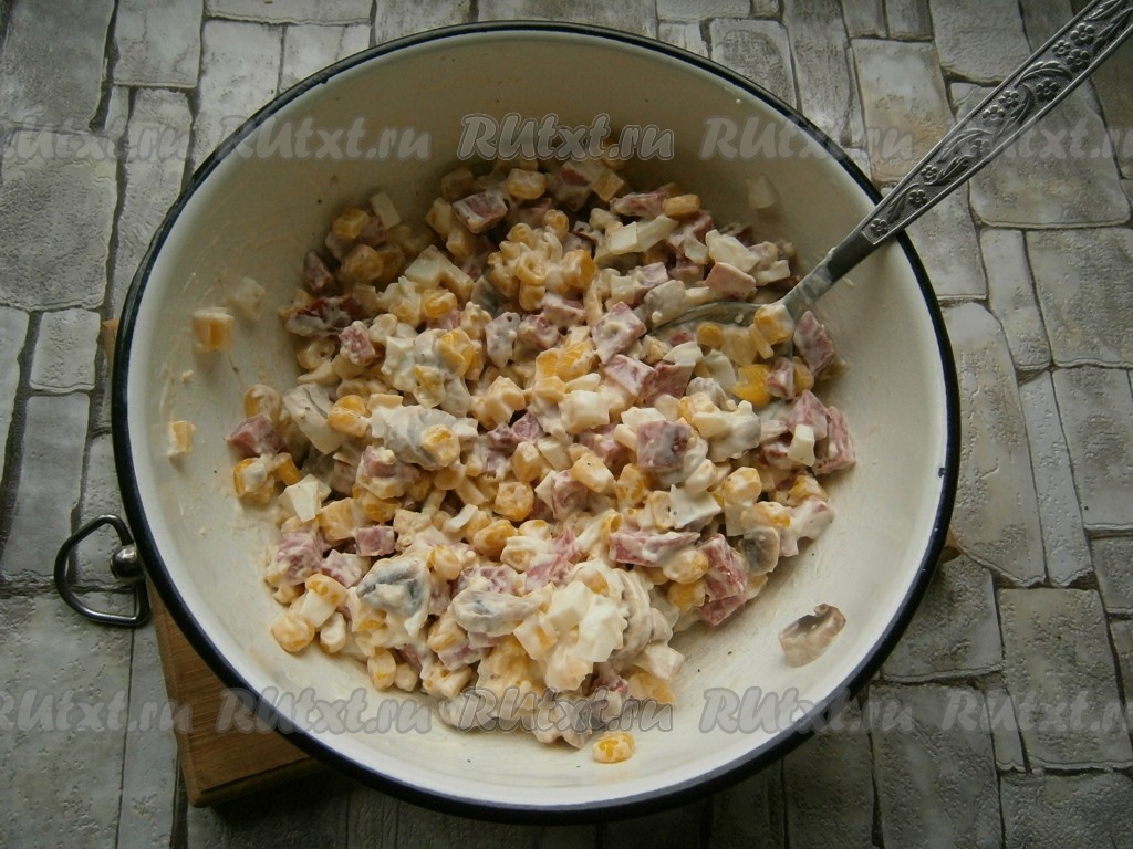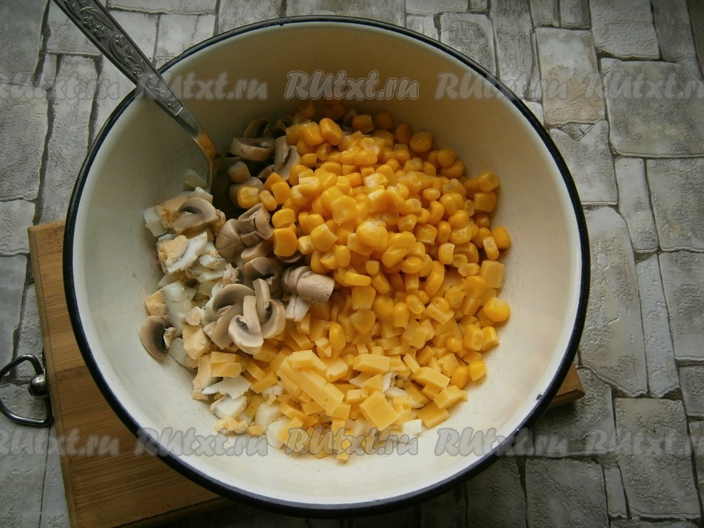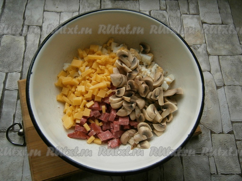 Сыр нарезать маленькими кубиками. Маринованные шампиньоны нарезать и вместе с кубиками сыра добавить в салат из колбасы и яиц.