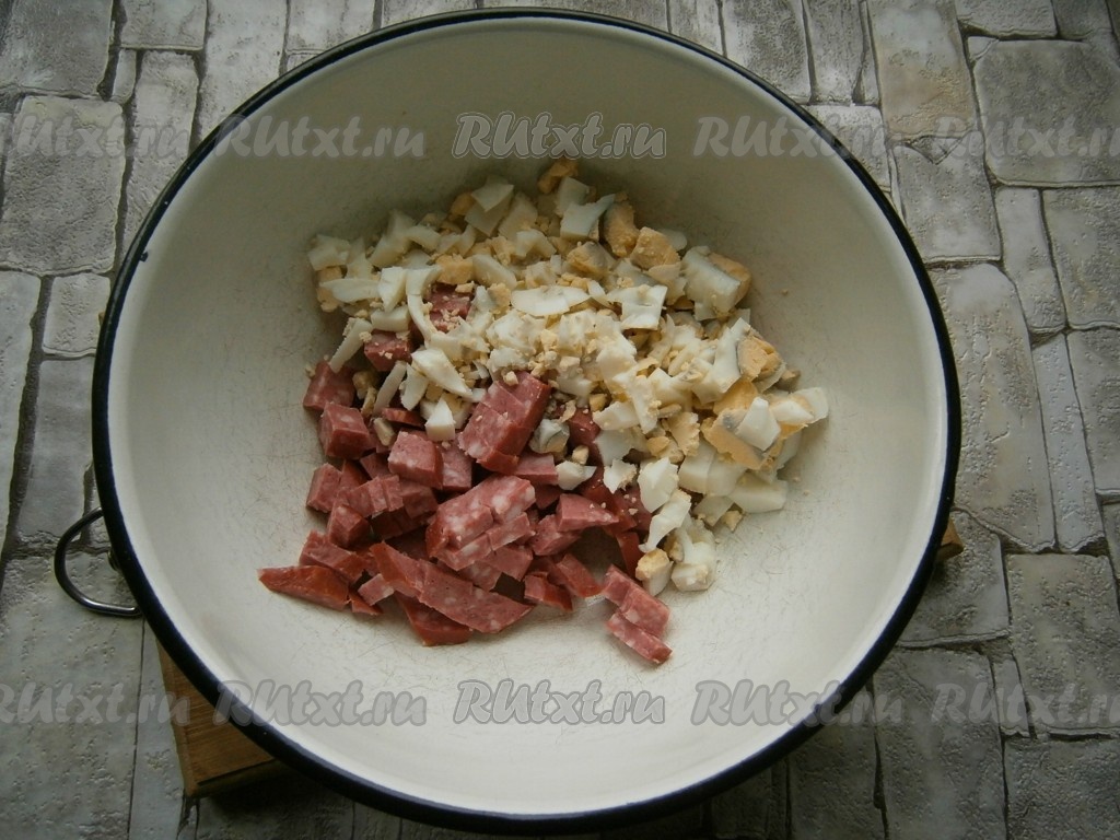 Колбасу нарезать небольшими кубиками, добавить рубленные вареные яйца.