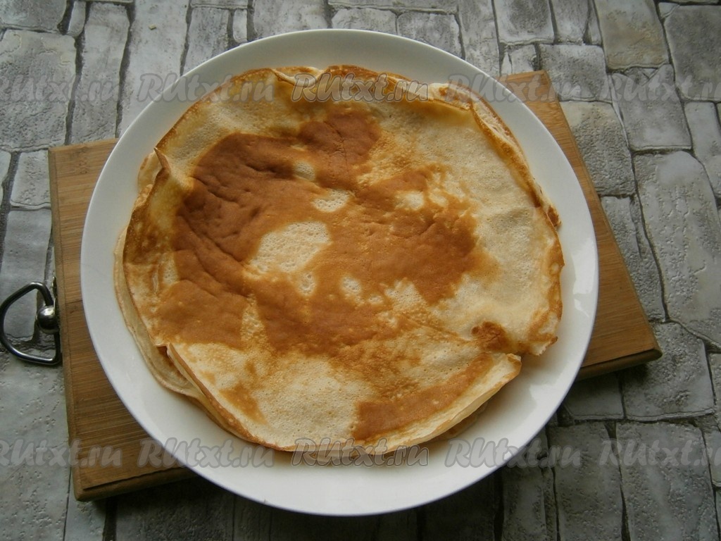 Готовый блинчик снять со сковороды и выложить на тарелку. Таким образом пожарить все блины, складывая их стопочкой на тарелку. Тесто в миске нужно периодически перемешивать. Сковороду я смазывала маслом только по мере необходимости.