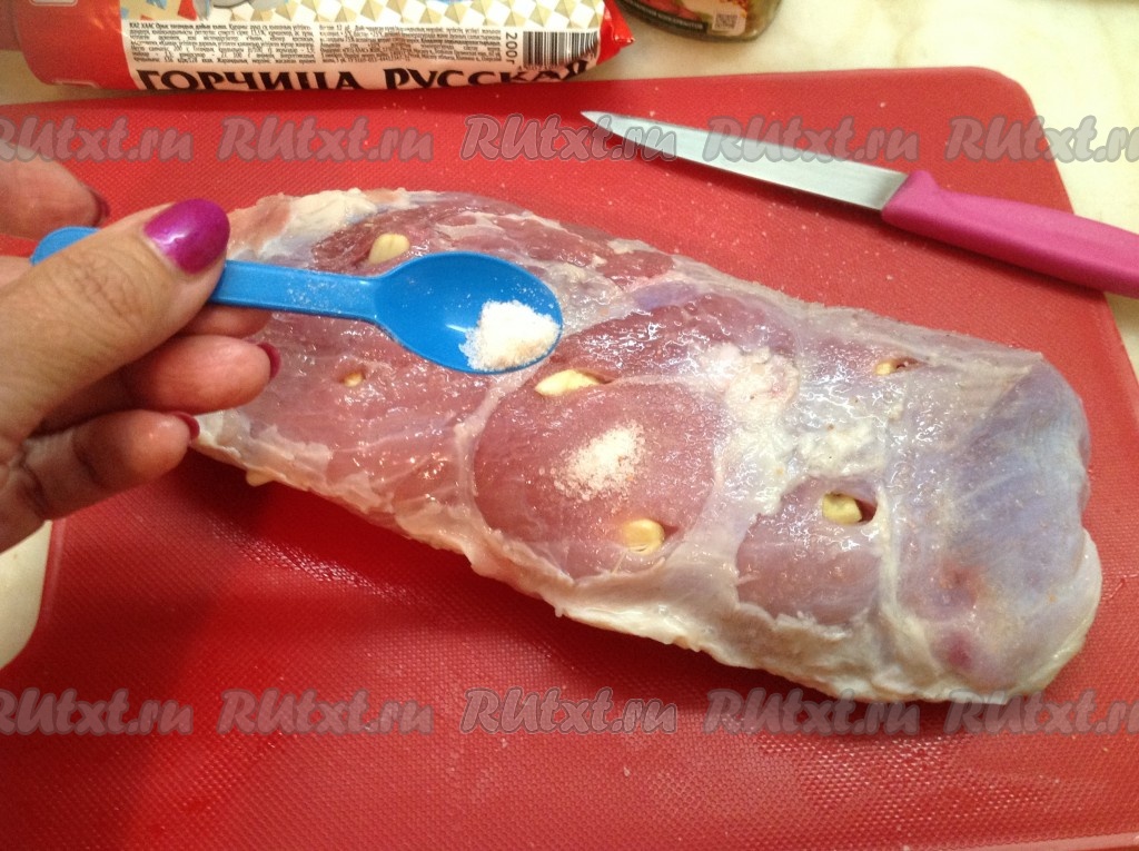 Нашпиговать карбонат чесноком и натереть солью со всех сторон. Включить духовку и разогреть до 200 градусов.