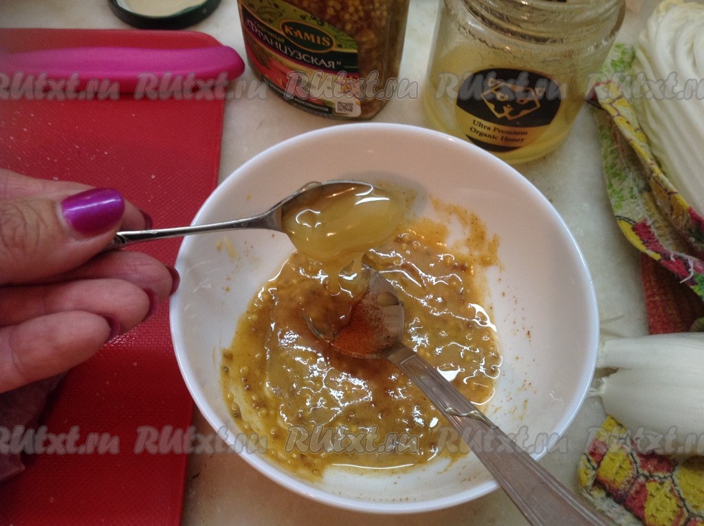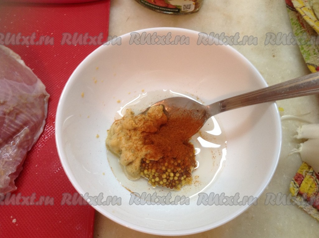 Смешать в мисочке два вида горчицы, паприку и растительное масло.