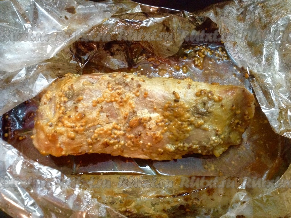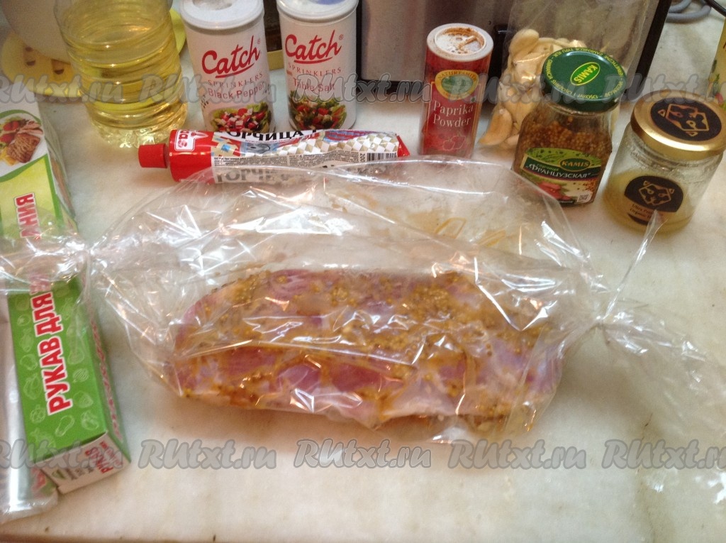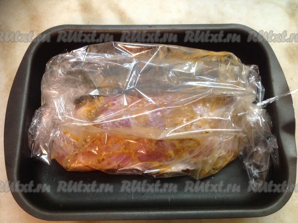 Выложить мясо в рукаве на противень, затянув предварительно рукав специальными зажимами с двух сторон. Стараться, чтобы поверхность рукава не касалась мяса - для этого необходимо оставить немного воздуха в рукаве.