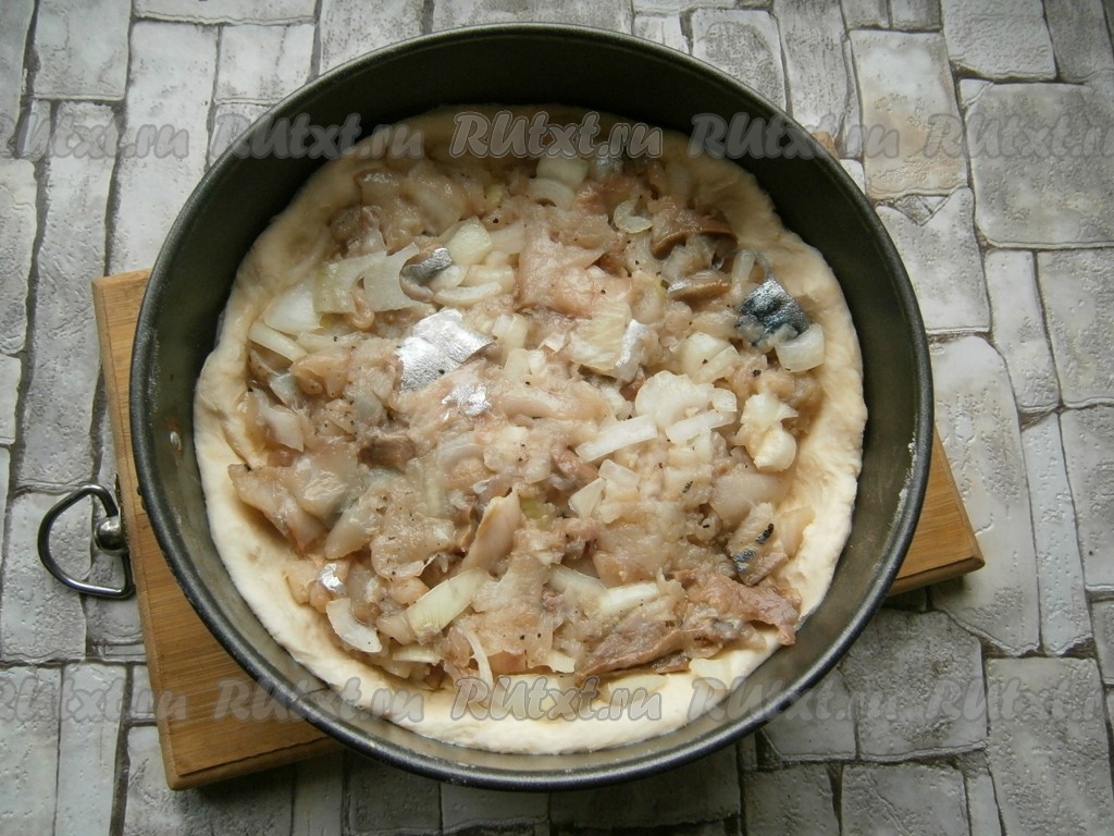 Тесто разделить на 2 неравные части - одну больше, одну чуть меньше. Большую часть теста немного раскатать и выложить в разъемную форму диаметром 17-19 см (при желании, форму перед выкладыванием теста можно смазать маслом), формируя небольшие бортики. Выложить на тесто всю рыбу, разровнять.