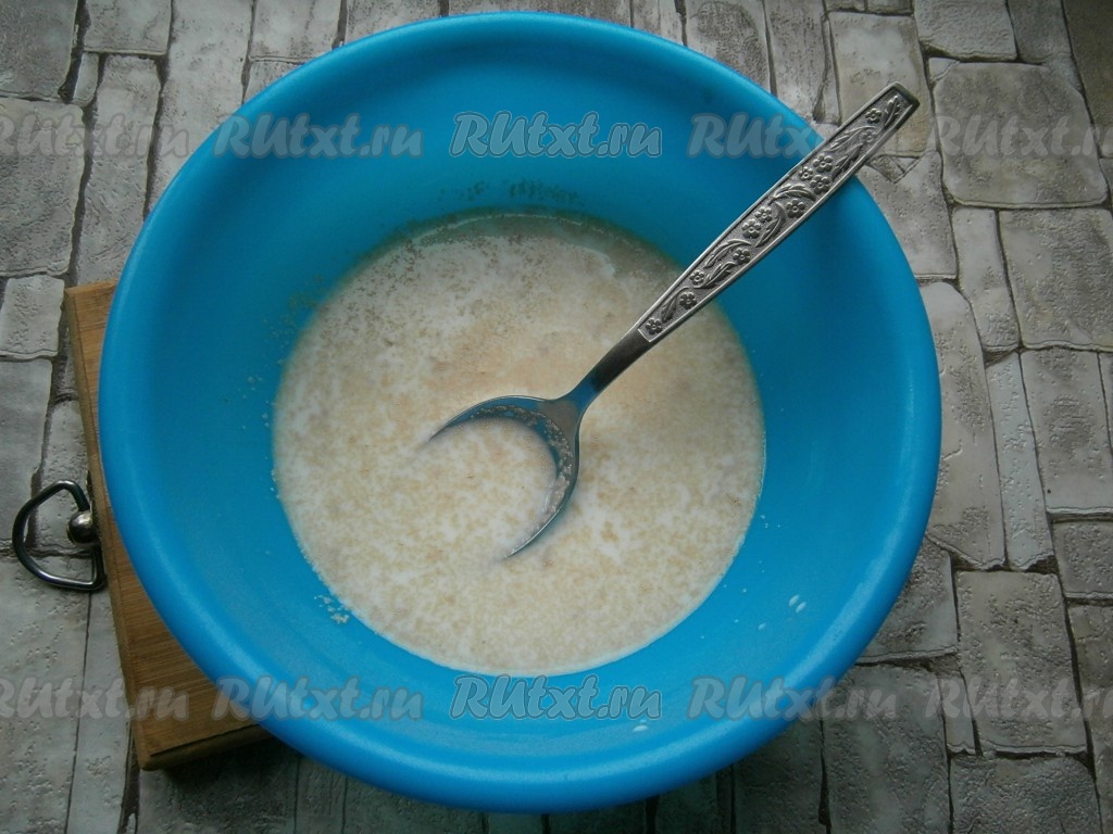 В теплое молоко добавить сахар и всыпать дрожжи, перемешать, накрыть пленкой, оставить в теплом месте на 15 минут (за это время дрожжи "оживут" и запенятся).