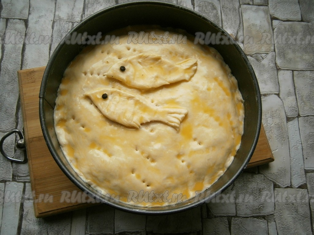 Вторую часть теста также раскатать и покрыть рыбу. По краям тесто хорошо прижать. Смазать пирог сырым желтком, наколоть сверху вилкой.