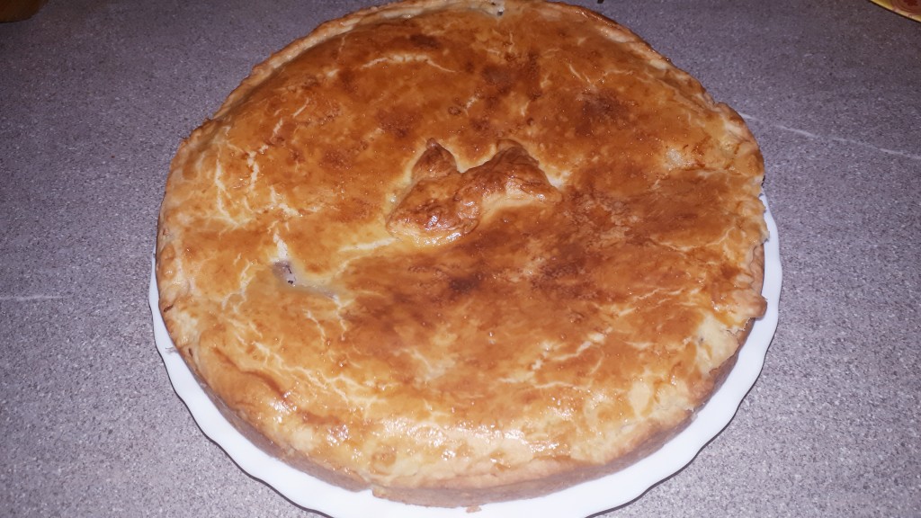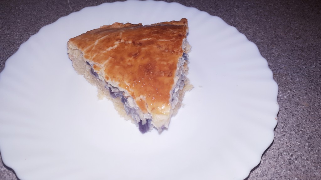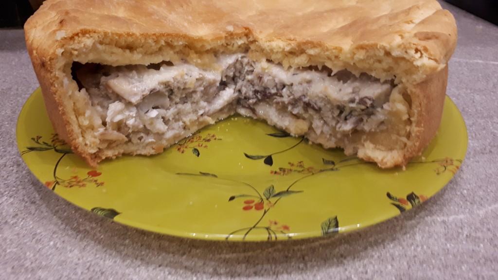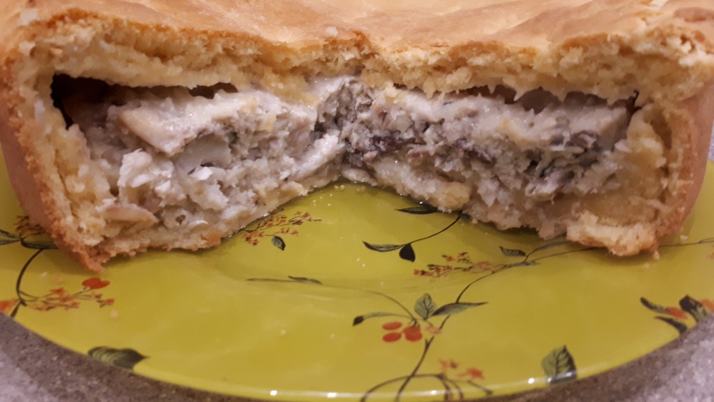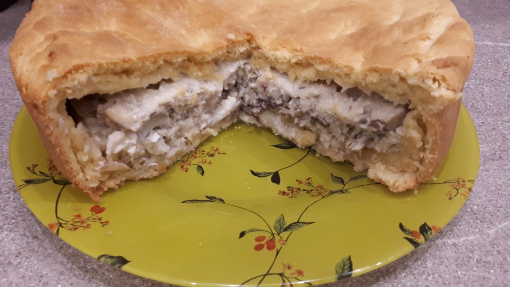 Освободить вкуснейший пирог, приготовленный со скумбрией, от формы, нарезать и в теплом виде подать к столу!
