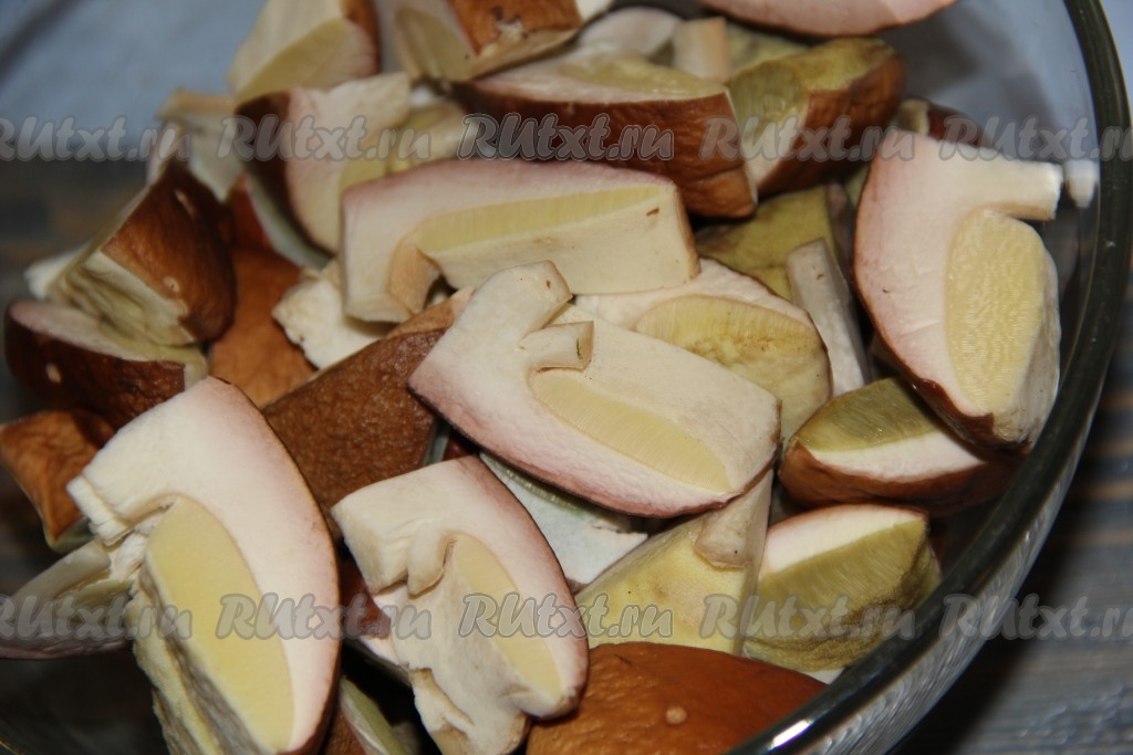 Свежие лесные грибы перебрать, очистить от травы и земли. Нарезать грибочки на кусочки среднего размера, маленькие грибы оставьте целыми.