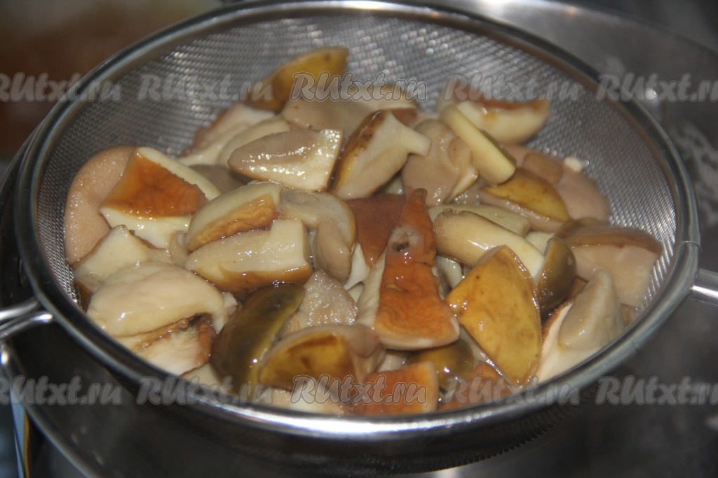 По истечении времени вареные грибы выложить в дуршлаг, дать стечь воде.