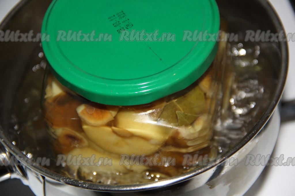 Прикрыть банки прокипяченными крышками. На дно кастрюли, в которой будем стерилизовать банки, можно положить тряпочку, сложенную в несколько раз. Влить в кастрюлю горячую воду. Банки с грибами аккуратно поставить в кастрюлю с водой (вода должна быть по "плечики" банок). Поставить кастрюлю с банками на средний огонь и стерилизовать 15 минут с момента закипания.