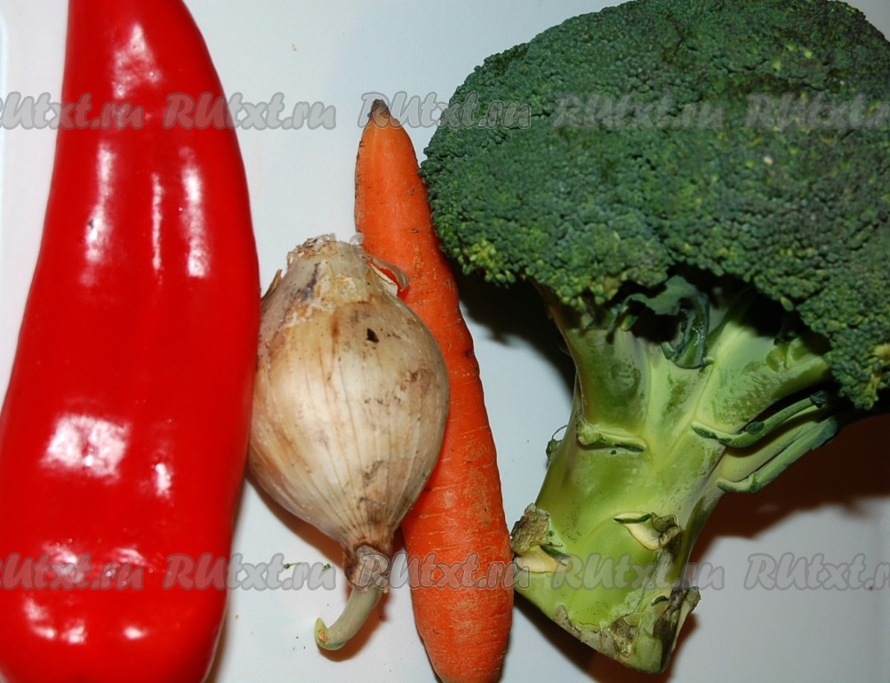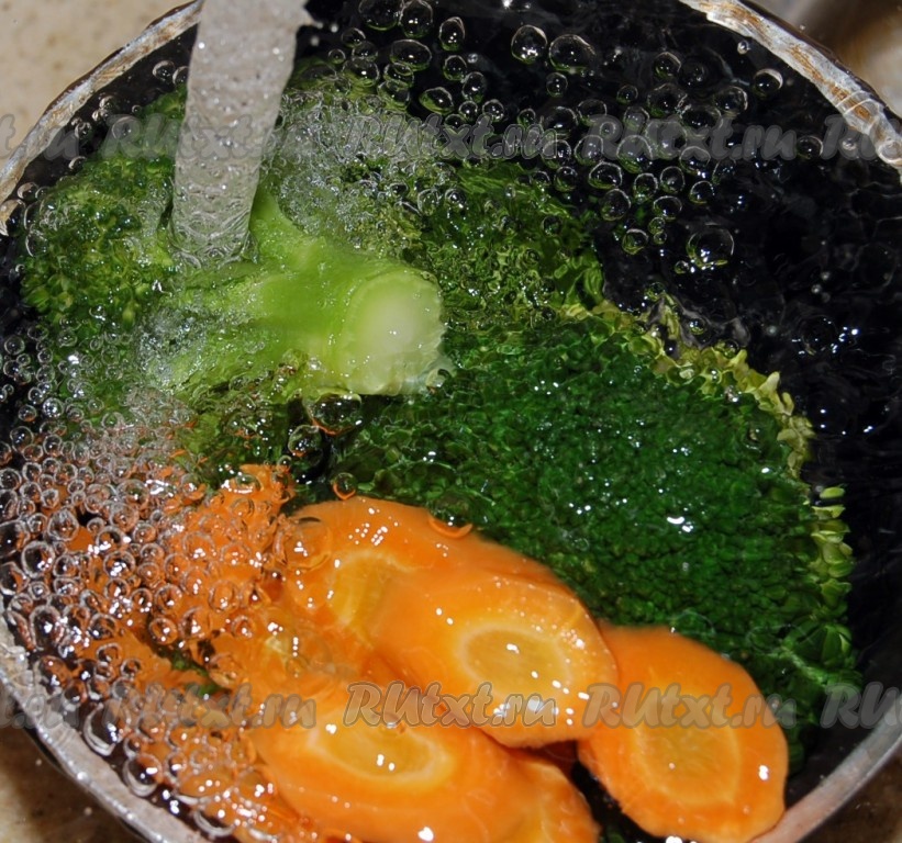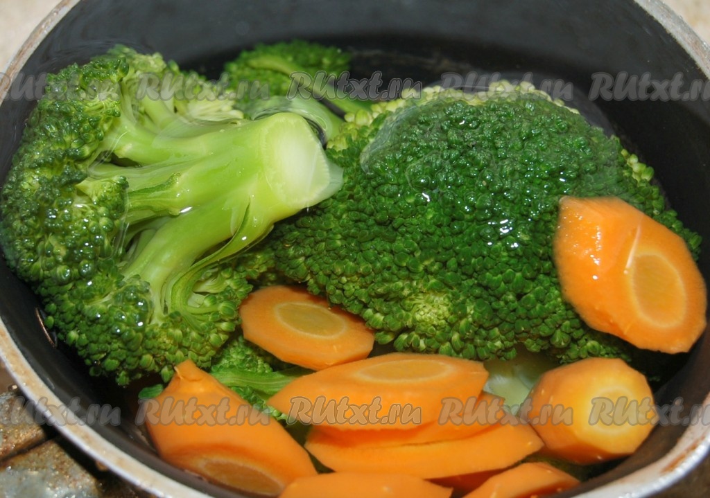 Взять небольшую кастрюльку, налить в нее воду, довести до кипения и опустить в кипящую воду соцветия брокколи и нарезанную морковь.