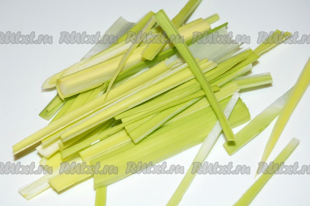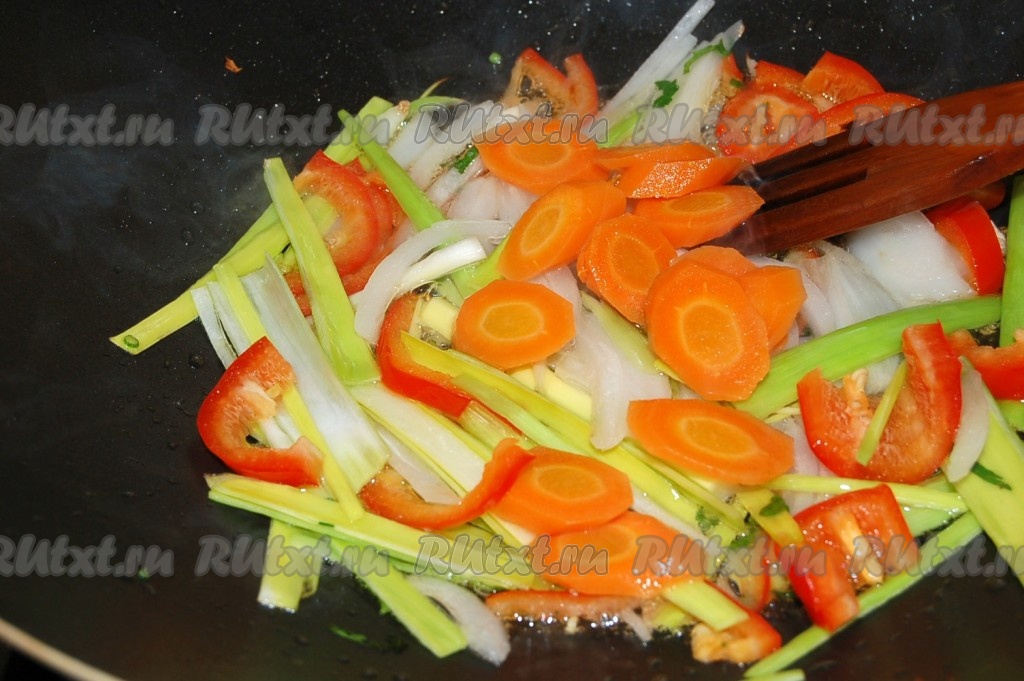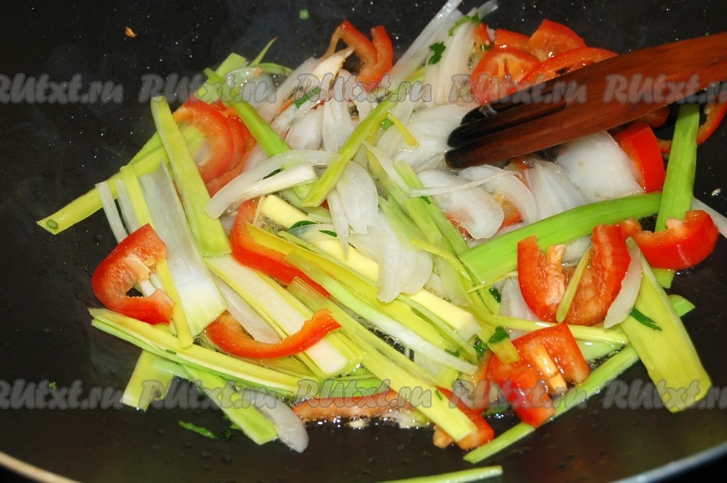 Разогреть сковороду вок, в раскаленное масло отправить перец сладкий, лук репчатый и лук порей. Обжаривать 2 минуты.