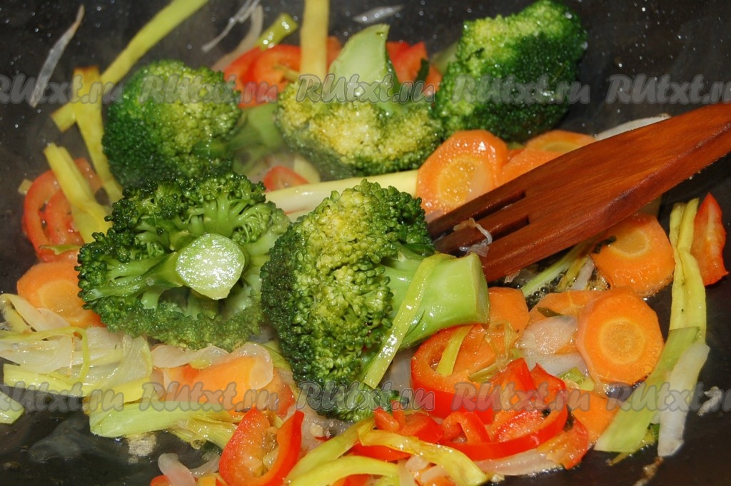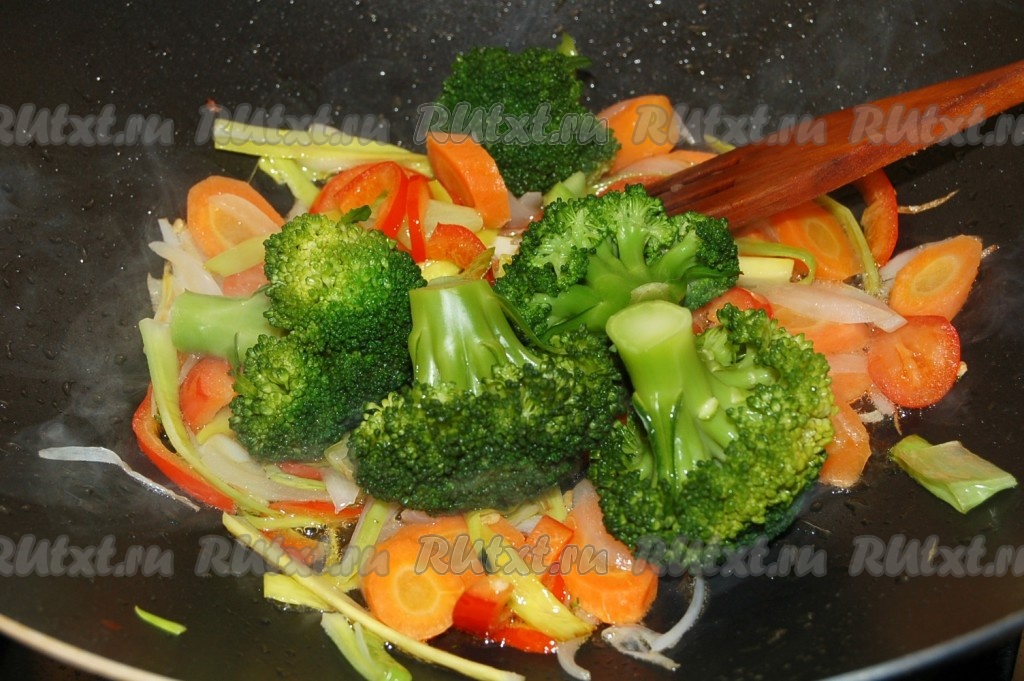 Теперь добавить брокколи. Обжаривать 2 минуты.