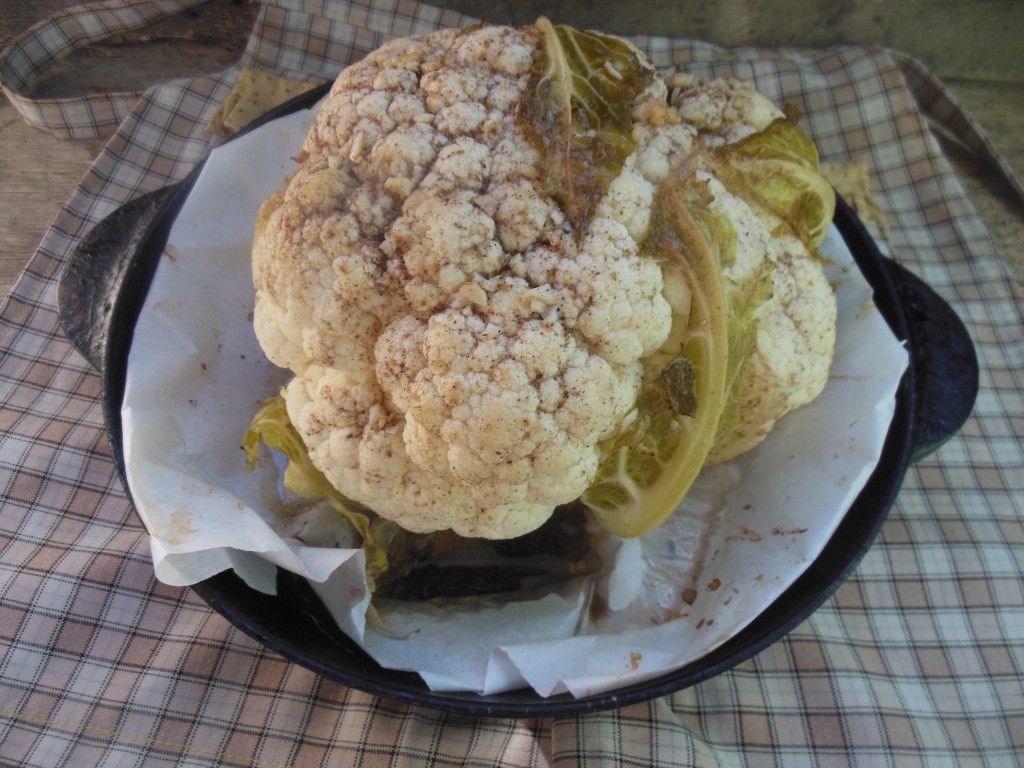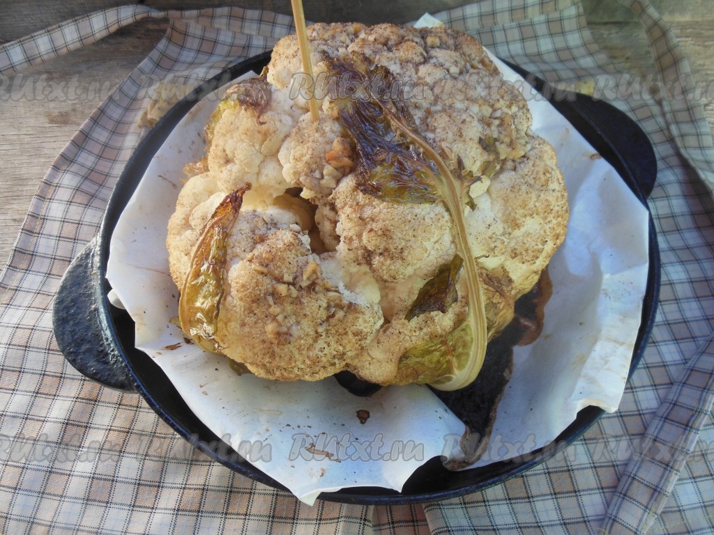 Затем снимите фольгу и запекайте в духовке еще 5-7 минут (до легкого румянца). Готовность проверьте длинной деревянной шпажкой, она должна без труда входить в капусту. Подать цветную капусту, запеченную целиком, можно горячей или в остывшем виде.