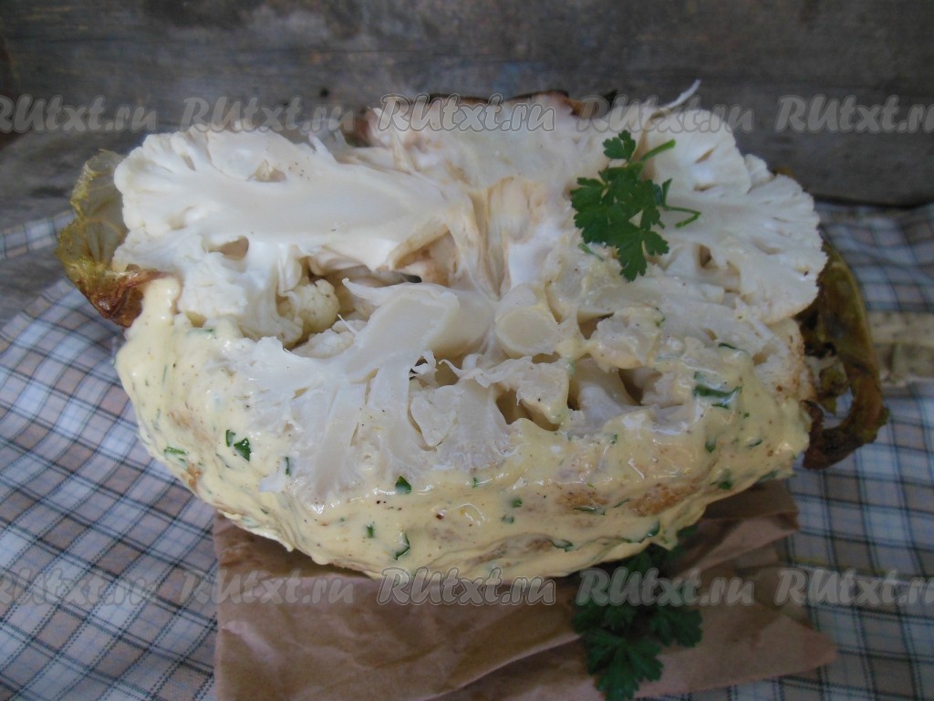 Цветная капуста, запеченная целиком в духовке, получается очень вкусной, её можно подать к столу в качестве самостоятельного блюда или в качестве гарнира к мясу. Пои желании, из такой капусты можно приготовить салатик, просто нарезав на небольшие соцветия и заправив соусом. Вкусно и полезно, попробуйте!
