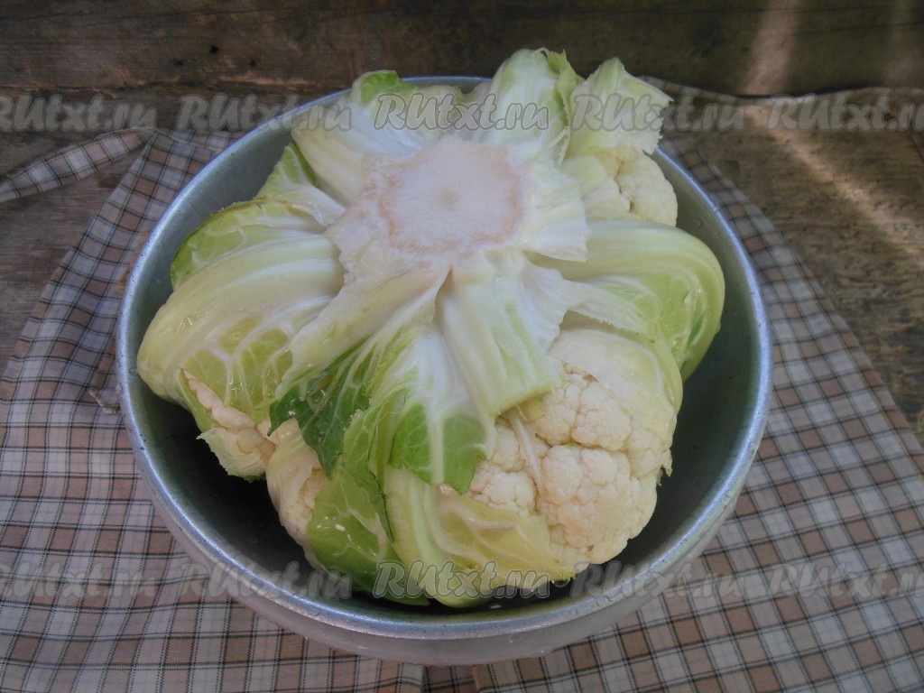 Кочан цветной капусты промойте под проточной водой. Листья не удаляйте, они, как и капуста, съедобны. Я удалила только поврежденные листья.